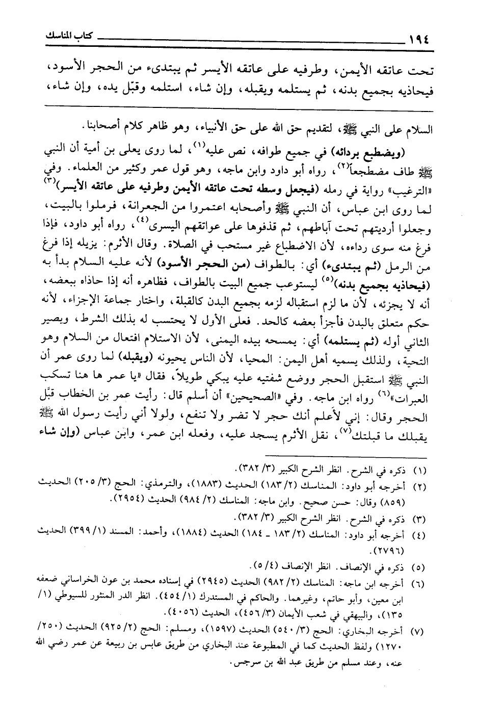 (وَيَضْطَبِعُ بِرِدَائِهِ) فِي جَمِيعِ طَوَافِهِ، نَصَّ عَلَيْهِ، لِمَا رَوَى يَعْلَى بْنُ أُمَيَّةَ «أَنَّ النَّبِيَّ - صَلَّى اللَّهُ عَلَيْهِ وَسَلَّمَ - طَافَ مُضْطَبِعًا» . رَوَاهُ أَبُو دَاوُدَ وَابْنُ مَاجَهْ، وَهُوَ قَوْلُ عُمَرَ وَكَثِيرٍ مِنَ الْعُلَمَاءِ، وَفِي " التَّرْغِيبِ " رِوَايَةٌ فِي رَمْلِهِ «فَيَجْعَلُ وَسَطَهُ تَحْتَ عَاتِقِهِ الْأَيْمَنِ، وَطَرَفَيْهِ عَلَى عَاتِقِهِ الْأَيْسَرِ» لِمَا رَوَى ابْنُ عَبَّاسٍ أَنَّ النَّبِيَّ - صَلَّى اللَّهُ عَلَيْهِ وَسَلَّمَ - وَأَصْحَابَهُ اعْتَمَرُوا مِنَ الْجِعْرَانَةَ فَرَمَلُوا بِالْبَيْتِ، وَجَعَلُوا أَرْدِيَتَهُمْ تَحْتَ آبَاطِهِمْ، ثُمَّ قَذَفُوهَا عَلَى عَوَاتِقِهِمُ الْيُسْرَى. رَوَاهُ أَبُو دَاوُدَ فَإِذَا فَرَغَ مِنْهُ سَوَّى رِدَاءَهُ؛ لِأَنَّ الِاضْطِبَاعَ غَيْرُ مُسْتَحَبٍّ فِي الصَّلَاةِ، وَقَالَ الْأَثْرَمُ: يُزِيلُهُ إِذَا فَرَغَ مِنَ الرَّمَلِ (ثُمَّ يَبْتَدِئُ) أَيْ: بِالطَّوَافِ (مِنَ الْحَجَرِ الْأَسْوَدِ) ؛ لِأَنَّهُ - عَلَيْهِ السَّلَامُ - بَدَأَ بِهِ (فَيُحَاذِيهِ بِجَمِيعِ بَدَنِهِ) لِيَسْتَوْعِبَ جَمِيعَ الْبَيْتِ بِالطَّوَافِ، فَظَاهِرُهُ أَنَّهُ إِذَا حَاذَاهُ بِبَعْضِهِ، أَنَّهُ لَا يُجْزِئُهُ؛ لِأَنَّ مَا لَزِمَ اسْتِقْبَالُهُ لَزِمَهُ بِجَمِيعِ الْبَدَنِ كَالْقِبْلَةِ، وَاخْتَارَ جَمَاعَةٌ الْإِجْزَاءُ؛ لِأَنَّهُ حُكْمٌ مُتَعَلِّقٌ بِالْبَدَنِ فَأَجْزَأَ بَعْضُهُ كَالْحَدِّ. فَعَلَى الْأَوَّلِ لَا يُحْتَسَبُ لَهُ بِذَلِكَ الشَّرْطِ وَيَصِيرُ الثَّانِي أَوَّلَهُ (ثُمَّ يَسْتَلِمُهُ) أَيْ: يَمْسَحُهُ بِيَدِهِ الْيُمْنَى؛ لِأَنَّ الِاسْتِلَامَ افْتِعَالٌ مِنَ السَّلَامِ، وَهُوَ التَّحِيَّةُ، وَلِذَلِكَ يُسَمِّيهِ أَهْلُ الْيَمَنِ: الْمُحَيَّا؛ لِأَنَّ النَّاسَ يُحَيُّونَهُ، (وَيُقَبِّلُهُ) «لِمَا رَوَى عُمَرُ أَنَّ النَّبِيَّ - صَلَّى اللَّهُ عَلَيْهِ وَسَلَّمَ - اسْتَقْبَلَ الْحَجَرَ، وَوَضَعَ شَفَتَيْهِ عَلَيْهِ يَبْكِي طَوِيلًا فَقَالَ: يَا عُمَرُ هَاهُنَا تُسْكَبُ الْعَبَرَاتُ» . رَوَاهُ ابْنُ مَاجَهْ، وَفِي " الصَّحِيحَيْنِ " أَنَّ أَسْلَمَ قَالَ: رَأَيْتُ عُمَرَ بْنَ الْخَطَّابِ قَبَّلَ الْحَجَرَ، وَقَالَ: إِنِّي لَأَعْلَمُ أَنَّكَ حَجَرٌ لَا تَضُرُّ وَلَا تَنْفَعُ، وَلَوْلَا أَنِّي رَأَيْتُ رَسُولَ اللَّهِ - صَلَّى اللَّهُ عَلَيْهِ وَسَلَّمَ - يُقَبِّلُكَ مَا قَبَّلْتُكَ، نَقَلَ الْأَثْرَمُ يَسْجُدُ عَلَيْهِ، وَفَعَلَهُ ابْنُ عُمَرَ، وَابْنُ عَبَّاسٍ (وَإِنْ شَاءَ