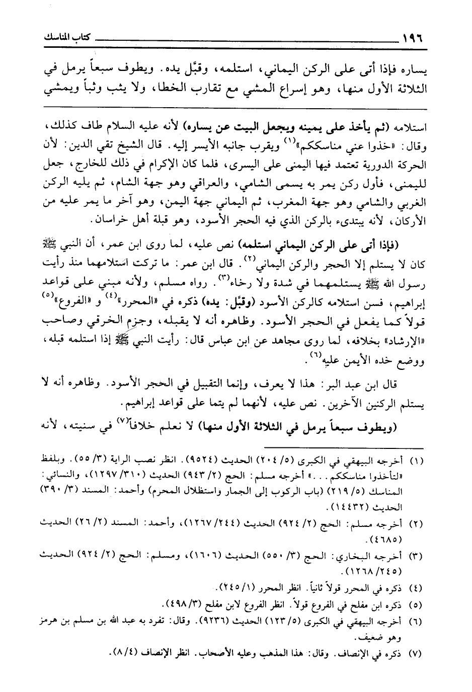 (فَإِذَا أَتَى عَلَى الرُّكْنِ الْيَمَانِيِّ اسْتَلَمَهُ) نَصَّ عَلَيْهِ، لِمَا رَوَى ابْنُ عُمَرَ أَنَّ «النَّبِيَّ - صَلَّى اللَّهُ عَلَيْهِ وَسَلَّمَ - كَانَ لَا يَسْتَلِمُ إِلَّا الْحَجَرَ، وَالرُّكْنَ الْيَمَانِيَّ قَالَ ابْنُ عُمَرَ: مَا تَرَكَتُ اسْتِلَامَهُمَا مُنْذُ رَأَيْتُ رَسُولَ اللَّهِ - صَلَّى اللَّهُ عَلَيْهِ وَسَلَّمَ - يَسْتَلِمُهُمَا فِي شِدَّةٍ وَلَا رَخَاءٍ» . رَوَاهُ مُسْلِمٌ، وَلِأَنَّهُ مَبْنِيٌّ عَلَى قَوَاعِدِ إِبْرَاهِيمَ فَسَنَّ اسْتِلَامَهُ كَالرُّكْنِ الْأَسْوَدِ، (وَقَبَّلَ يَدَهُ) ذَكَرَهُ فِي " الْمُحَرَّرِ " وَ " الْفُرُوعِ " قَوْلًا كَمَا يَفْعَلُ فِي الْحَجَرِ الْأَسْوَدِ. وَظَاهِرُهُ أَنَّهُ لَا يُقَبِّلُهُ، وَجَزَمَ الْخِرَقِيُّ وَصَاحِبُ " الْإِرْشَادِ " بِخِلَافِهِ لِمَا رَوَى مُجَاهِدٌ عَنِ ابْنِ عَبَّاسٍ قَالَ: «رَأَيْتُ النَّبِيَّ - صَلَّى اللَّهُ عَلَيْهِ وَسَلَّمَ - إِذَا اسْتَلَمَهُ قَبَّلَهُ، وَوَضَعَ خَدَّهُ الْأَيْمَنَ عَلَيْهِ» .