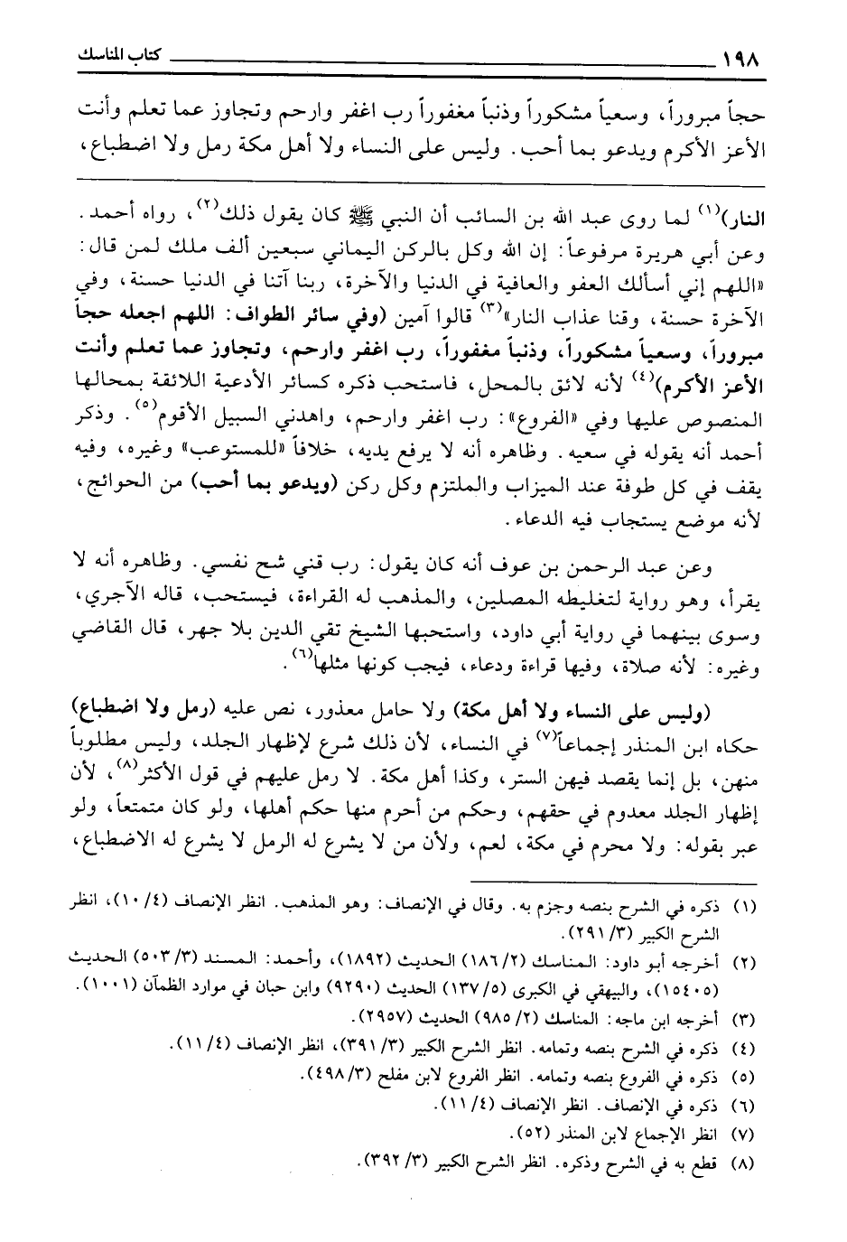 حَجًّا مَبْرُورًا، وَسَعْيًا مَشْكُورًا، وَذَنْبًا مَغْفُورًا، رَبِّ اغْفِرْ وَارْحَمْ، وَتَجَاوَزْ عَمَّا تَعْلَمُ، وَأَنْتَ الْأَعَزُّ الْأَكْرَمُ وَيَدْعُو بِمَا أَحَبَّ. وَلَيْسَ عَلَى النِّسَاءِ وَلَا أَهْلِ مَكَّةَ رَمَلٌ وَلَا اضْطِبَاعٌ،