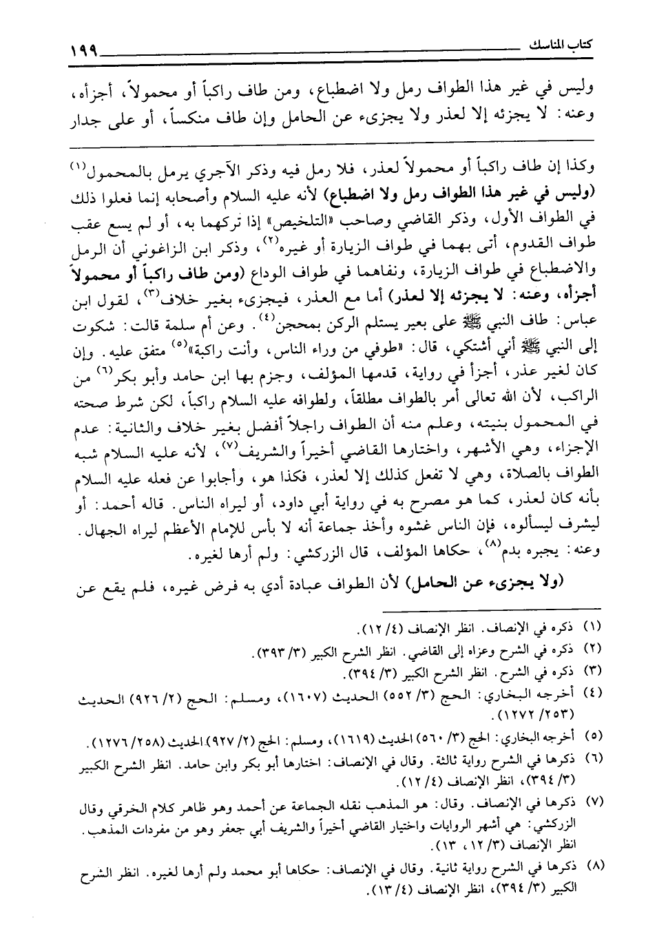 ـــــــــــــــــــــــــــــQوَكَذَا إِنْ طَافَ رَاكِبًا أَوْ مَحْمُولًا لِعُذْرٍ، فَلَا رَمَلَ فِيهِ، وَذَكَرَ الْآجُرِّيُّ يَرْمُلُ بِالْمَحْمُولِ (وَلَيْسَ فِي غَيْرِ هَذَا الطَّوَافِ رَمَلٌ وَلَا اضْطِبَاعٌ) ؛ لِأَنَّهُ - عَلَيْهِ السَّلَامُ - وَأَصْحَابَهُ إِنَّمَا فَعَلُوا ذَلِكَ فِي الطَّوَافِ الْأَوَّلِ، وَذَكَرَ الْقَاضِي وَصَاحِبُ " التَّلْخِيصِ ": إِذَا تَرَكَهُمَا بِهِ، أَوْ لَمْ يَسْعَ عَقِبَ طَوَافِ الْقُدُومِ أَتَى بِهِمَا فِي طَوَافِ الزِّيَارَةِ أَوْ غَيْرِهِ، وَذَكَرَ ابْنُ الزَّاغُونِيِّ أَنَّ الرَّمَلَ وَالِاضْطِبَاعَ فِي طَوَافِ الزِّيَارَةِ، وَنَفَاهُمَا فِي طَوَافِ الْوَدَاعِ (وَمَنْ طَافَ رَاكِبًا أَوْ مَحْمُولًا أَجْزَأَهُ، وَعَنْهُ: لَا يُجْزِئُهُ إِلَّا لِعُذْرٍ) أَمَّا مَعَ الْعُذْرِ فَيُجْزِئُ بِغَيْرِ خِلَافٍ لِقَوْلِ ابْنِ عَبَّاسٍ «طَافَ النَّبِيُّ - صَلَّى اللَّهُ عَلَيْهِ وَسَلَّمَ - عَلَى بَعِيرٍ يَسْتَلِمُ الرُّكْنَ بِمِحْجَنٍ» . وَعَنْ أَمِّ سَلَمَةَ قَالَتْ: «شَكَوْتُ إِلَى النَّبِيِّ - صَلَّى اللَّهُ عَلَيْهِ وَسَلَّمَ - أَنِّي أَشْتَكِي، قَالَ: طُوفِي مِنْ وَرَاءِ النَّاسِ وَأَنْتِ رَاكِبَةٌ» . مُتَّفَقٌ عَلَيْهِ. وَإِنْ كَانَ لِغَيْرِ عُذْرٍ، أَجْزَأَ فِي رِوَايَةٍ قَدَّمَهَا الْمُؤَلِّفُ وَجَزَمَ بِهَا ابْنُ حَامِدٍ، وَأَبُو بَكْرٍ مِنَ الرَّاكِبِ؛ لِأَنَّ اللَّهَ - تَعَالَى - أَمَرَ بِالطَّوَافِ مُطْلَقًا، وَلِطَوَافِهِ - عَلَيْهِ السَّلَامُ - رَاكِبًا، لَكِنَّ شَرْطَ صِحَّتِهِ فِي الْمَحْمُولِ بِنِيَّتِهِ، وَعُلِمَ مِنْهُ أَنَّ الطَّوَافَ رَاجِلًا أَفْضَلُ بِغَيْرِ خِلَافٍ، وَالثَّانِيَةُ: عَدَمُ الْإِجْزَاءِ، وَهِيَ الْأَشْهَرُ، وَاخْتَارَهَا الْقَاضِي أَخِيرًا، وَالشَّرِيفُ؛ لِأَنَّهُ - عَلَيْهِ السَّلَامُ - شَبَّهَ الطَّوَافَ بِالصَّلَاةِ، وَهِيَ لَا تَفْعَلُ كَذَلِكَ إِلَّا لِعُذْرٍ فَكَذَا هُوَ، وَأَجَابُوا عَنْ فِعْلِهِ - عَلَيْهِ السَّلَامُ - بِأَنَّهُ كَانَ لِعُذْرٍ كَمَا هُوَ مُصَرَّحٌ بِهِ فِي رِوَايَةِ أَبِي دَاوُدَ، أَوْ لِيَرَاهُ النَّاسُ. قَالَهُ أَحْمَدُ أَوْ لِيَشْرُفَ لِيَسْأَلُوهُ، فَإِنَّ النَّاسَ غَشَوْهُ، وَأَخَذَ جَمَاعَةٌ: أَنَّهُ لَا بَأْسَ لِلْإِمَامِ الْأَعْظَمِ لِيَرَاهُ الْجُهَّالُ، وَعَنْهُ: يَجْبُرُهُ بِدَمٍ حَكَاهَا الْمُؤَلِّفُ. قَالَ الزَّرْكَشِيُّ. وَلَمْ أَرَهَا لِغَيْرِهِ.