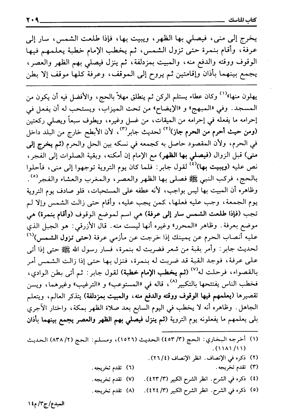 يَخْرُجُ إِلَى مِنًى، فَيُصَلِّي بِهَا الظُّهْرَ، وَيَبِيتُ بِهَا، فَإِذَا طَلَعَتِ الشَّمْسُ، سَارَ إِلَى عَرَفَةَ، وَأَقَامَ بِنَمِرَةَ حَتَّى تَزُولَ الشَّمْسُ، ثُمَّ يَخْطُبُ الْإِمَامُ خُطْبَةً يُعَلِّمُهُمْ فِيهَا الْوُقُوفَ وَوَقْتَهُ وَالدَّفْعَ مِنْهُ، وَالْمَبِيتَ بِمُزْدَلِفَةَ، ثُمَّ يَنْزِلُ فَيُصَلِّي بِهِمُ الظُّهْرَ وَالْعَصْرَ، يَجْمَعُ بَيْنَهُمَا بِأَذَانٍ وَإِقَامَتَيْنِ، ثُمَّ يَرُوحُ إِلَى الْمَوْقِفِ.