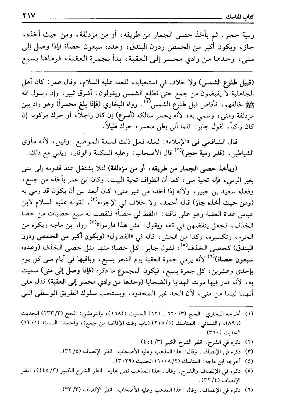 رَمْيَةِ حَجَرٍ. ثُمَّ يَأْخُذُ حَصَى الْجِمَارِ مِنْ طَرِيقِهِ، أَوْ مِنْ مُزْدَلِفَةَ، وَمِنْ حَيْثُ أَخَذَهُ، جَازَ، وَيَكُونُ أَكْبَرَ مِنَ الْحِمَّصِ وَدُونَ الْبُنْدُقِ، وَعَدَدُهُ سَبْعُونَ حَصَاةً، فَإِذَا وَصَلَ إِلَى مِنًى، وَحْدَهَا مِنْ وَادِي مُحَسِّرٍ إِلَى الْعَقَبَةِ بَدَأَ بِجَمْرَةِ الْعَقَبَةِ، فَرَمَاهَا بِسَبْعِ
