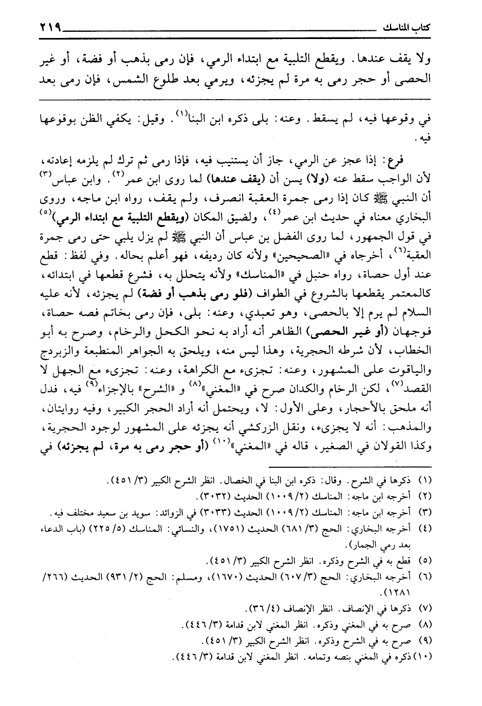 فَرْعٌ: إِذَا عَجَزَ عَنِ الرَّمْيِ جَازَ أَنْ يَسْتَنِيبَ فِيهِ، فَإِذَا رَمَى، ثُمَّ تَرَكَ لَمْ يَلْزَمْهُ إِعَادَتُهُ؛ لِأَنَّ الْوَاجِبَ سَقَطَ عَنْهُ (وَلَا) يُسَنُّ أَنْ (يَقِفُ عِنْدَهَا) لِمَا رَوَى ابْنُ عُمَرَ، وَابْنُ عَبَّاسٍ «أَنَّ النَّبِيَّ - صَلَّى اللَّهُ عَلَيْهِ وَسَلَّمَ - كَانَ إِذَا رَمَى جَمْرَةَ الْعَقَبَةِ انْصَرَفَ، وَلَمْ يَقِفْ» . رَوَاهُ ابْنُ مَاجَهْ، وَرَوَى الْبُخَارِيُّ مَعْنَاهُ فِي حَدِيثِ ابْنِ عُمَرَ، وَلِضِيقِ الْمَكَانِ (وَيَقْطَعُ التَّلْبِيَةَ مَعَ ابْتِدَاءِ الرَّمْيِ) فِي قَوْلِ الْجُمْهُورِ لِمَا رَوَى الْفَضْلُ بْنُ عَبَّاسٍ «أَنَّ النَّبِيَّ - صَلَّى اللَّهُ عَلَيْهِ وَسَلَّمَ - لَمْ يَزَلْ يُلَبِّي حَتَّى رَمَى جَمْرَةَ الْعَقَبَةِ» أَخْرَجَاهُ فِي " الصَّحِيحَيْنِ " وَلِأَنَّهُ كَانَ رَدِيفَهُ، فَهُوَ أَعْلَمُ بِحَالِهِ، وَفِي لَفْظٍ: قَطَعَ عِنْدَ أَوَّلِ حَصَاةٍ. رَوَاهُ حَنْبَلٌ فِي " الْمَنَاسِكِ " وَلِأَنَّهُ يَتَحَلَّلُ بِهِ فَشَرَعَ قَطْعَهَا فِي ابْتِدَائِهِ، كَالْمُعْتَمِرِ يَقْطَعُهَا بِالشُّرُوعِ فِي الطَّوَافِ (فَلَوْ رَمَى بِذَهَبٍ أَوْ فِضَّةٍ) لَمْ يُجْزِئْهُ؛ لِأَنَّهُ - عَلَيْهِ السَّلَامُ - لَمْ يَرْمِ إِلَّا بِالْحَصَى، وَهُوَ تَعَبُّدِيٌّ، وَعَنْهُ: بَلَى، فَإِنْ رَمَى بِخَاتَمٍ فَصُّهُ حَصَاةٌ، فَوَجْهَانِ (أَوْ غَيْرُ الْحَصَى) الظَّاهِرُ أَنَّهُ أَرَادَ بِهِ نَحْوَ الْكُحْلِ، وَالرُّخَامِ، وَصَرَّحَ بِهِ أَبُو الْخَطَّابِ؛ لِأَنَّ شُرَطَهُ الْحَجَرِيَّةُ، وَهَذَا لَيْسَ مِنْهُ، وَيُلْحَقُ بِهِ الْجَوَاهِرُ الْمُنْطَبِعَةُ، وَالزَّبَرْدَجُ، وَالْيَاقُوتُ عَلَى الْمَشْهُورِ، وَعَنْهُ: تُجْزِئُ مَعَ الْكَرَاهَةِ، وَعَنْهُ: تُجْزِئُ مَعَ الْجَهْلِ لَا الْقَصْدِ، لَكِنَّ الرُّخَامَ وَالْكِدَانَ صَرَّحَ فِي " الْمُغْنِي " وَ " الشَّرْحِ " بِالْإِجْزَاءِ، فِيهِ فَدَلَّ أَنَّهُ مُلْحَقٌ بِالْأَحْجَارِ، وَعَلَى الْأَوَّلِ: لَا، وَيُحْتَمَلُ أَنَّهُ أَرَادَ الْحَجَرَ الْكَبِيرَ، وَفِيهِ رِوَايَتَانِ، وَالْمَذْهَبُ أَنَّهُ لَا يُجْزِئُ، وَنَقَلَ الزَّرْكَشِيُّ أَنَّهُ يُجْزِئُهُ عَلَى الْمَشْهُورِ لِوُجُودِ الْحَجَرِيَّةِ، وَكَذَا الْقَوْلَانِ فِي الصَّغِيرِ قَالَهُ فِي " الْمُغْنِي " (أَوْ حَجَرٍ رمى بِهِ مَرَّةً لَمْ يُجْزِئْهُ) فِي