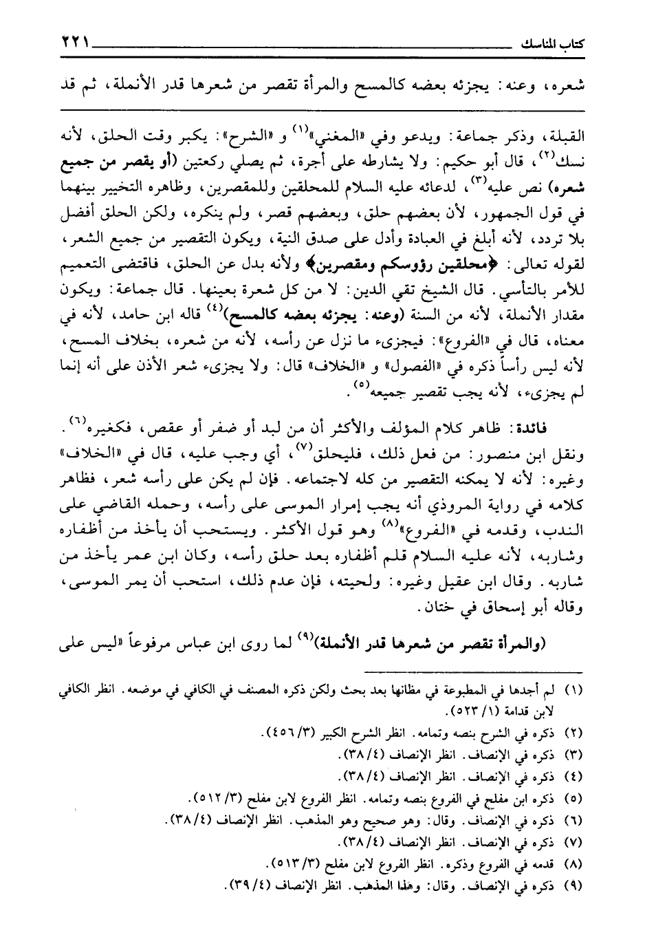 ـــــــــــــــــــــــــــــQالْقِبْلَةَ، وَذَكَرَ جَمَاعَةٌ: وَيَدْعُو، وَفِي " الْمُغْنِي " وَ " الشَّرْحِ ": يِكَبِّرُ وَقْتَ الْحَلْقِ؛ لِأَنَّهُ نُسُكٌ، قَالَ أَبُو حَكِيمٍ: وَلَا يُشَارِطُهُ عَلَى أُجْرَةٍ، ثُمَّ يُصَلِّي رَكْعَتَيْنِ (أَوْ يُقَصِّرُ مِنْ جَمِيعِ شَعْرِهِ) ، نَصَّ عَلَيْهِ، لِدُعَائِهِ - عَلَيْهِ السَّلَامُ - لِلْمُحَلِّقِينَ، وَلِلْمُقَصِّرِينَ. وَظَاهِرُهُ التَّخْيِيرُ بَيْنَهُمَا فِي قَوْلِ الْجُمْهُورِ؛ لِأَنَّ بَعْضَهُمْ حَلَقَ، وَبَعْضَهُمْ قَصَّرَ، وَلَمْ يُنْكِرْهُ، وَلَكِنَّ الْحَلْقَ أَفْضَلُ بِلَا تَرَدُّدٍ؛ لِأَنَّهُ أَبْلَغُ فِي الْعِبَادَةِ، وَأَدَلُّ عَلَى صِدْقِ النِّيَّةِ، وَيَكُونُ التَّقْصِيرُ مِنْ جَمِيعِ الشَّعْرِ لِقَوْلِهِ - تَعَالَى - {مُحَلِّقِينَ رُءُوسَكُمْ وَمُقَصِّرِينَ} [الفتح: 27] وَلِأَنَّهُ بَدَلٌ عَنِ الْحَلْقِ فَاقْتَضَى التَّعْمِيمَ لِلْأَمْرِ بِالتَّأَسِّي قَالَ الشَّيْخُ تَقِيُّ الدِّينِ: لَا مِنْ كُلِّ شَعْرَةٍ بِعَيْنِهَا قَالَ جَمَاعَةٌ: وَيَكُونُ مِقْدَارُ الْأُنْمُلَةِ؛ لِأَنَّهُ مِنَ السُّنَّةِ (وَعَنْهُ: يُجْزِئُهُ بَعْضُهُ كَالْمَسْحِ) قَالَهُ ابْنُ حَامِدٍ؛ لِأَنَّهُ فِي مَعْنَاهُ قَالَ فِي " الْفُرُوعِ ": فَيُجْزِئُ مَا نَزَلْ عَنْ رَأْسِهِ؛ لِأَنَّهُ مِنْ شَعْرِهِ بِخِلَافِ الْمَسْحِ؛ لِأَنَّهُ لَيْسَ رَأْسًا ذَكَرَهُ فِي " الْفُصُولِ " وَ " الْخِلَافِ " قَالَ: وَلَا يُجْزِئُ شَعْرُ الْأُذُنِ عَلَى أَنَّهُ إِنَّمَا لَمْ يُجْزِئْ؛ لِأَنَّهُ يَجِبُ تَقْصِيرُ جَمِيعِهِ.