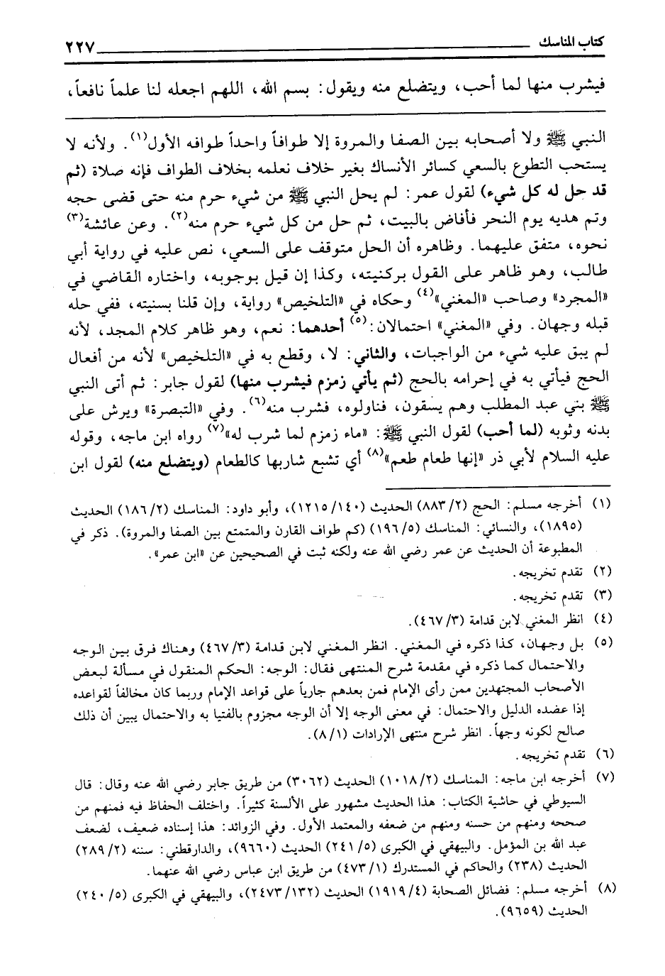 ـــــــــــــــــــــــــــــQالنَّبِيُّ - صَلَّى اللَّهُ عَلَيْهِ وَسَلَّمَ - وَلَا أَصْحَابُهُ بَيْنَ الصَّفَا وَالْمَرْوَةِ إِلَّا طَوَافًا وَاحِدًا طَوَافُهُ الْأَوَّلُ. وَلِأَنَّهُ لَا يُسْتَحَبُّ التَّطَوُّعُ بِالسَّعْيِ كَسَائِرِ الْأَنْسَاكِ بِغَيْرِ خِلَافٍ نَعْلَمُهُ بِخِلَافِ الطَّوَافِ فَإِنَّهُ صَلَاةٌ (ثُمَّ قَدْ حَلَّ لَهُ كُلِّ شَيْءٍ) «لِقَوْلِ عُمَرَ لَمْ يُحِلَّ النَّبِيُّ - صَلَّى اللَّهُ عَلَيْهِ وَسَلَّمَ - مِنْ شَيْءِ حَرِمَ مِنْهُ حَتَّى قَضَى حَجَّهُ وَتَمَّ هَدْيُهُ يَوْمَ النَّحْرِ فَأَفَاضَ بِالْبَيْتِ، ثُمَّ حَلَّ مِنْ كُلِّ شَيْءٍ حَرِمَ مِنْهُ» ، وَعَنْ عَائِشَةَ نَحْوُهُ. مُتَّفَقٌ عَلَيْهِمَا. وَظَاهِرُهُ أَنَّ الْحِلَّ مُتَوَقِّفٌ عَلَى السَّعْيِ، نَصَّ عَلَيْهِ فِي رِوَايَةِ أَبِي طَالِبٍ، وَهُوَ ظَاهِرٌ عَلَى الْقَوْلِ بِرُكْنِيَّتِهِ، وَكَذَا إِنْ قِيلَ بِوُجُوبِهِ، وَاخْتَارَهُ الْقَاضِي فِي " الْمُجَرَّدِ " وَصَاحِبُ " الْمُغْنِي " وَحَكَاهُ فِي " التَّلْخِيصِ " رِوَايَةً، وَإِنْ قُلْنَا بِسُنِّيَّتِهِ، فَفِي حِلِّهِ قَبْلَهُ وَجْهَانِ، وَفِي " الْمُغْنِي " احْتِمَالَانِ أَحَدُهُمَا: نَعَمْ، وَهُوَ ظَاهِرُ كَلَامِ الْمَجْدِ؛ لِأَنَّهُ لَمْ يَبْقَ عَلَيْهِ شَيْءٌ مِنَ الْوَاجِبَاتِ، وَالثَّانِي: لَا، وَقَطَعَ بِهِ فِي " التَّلْخِيصِ "؛ لِأَنَّهُ مِنْ أَفْعَالِ الْحَجِّ فَيَأْتِي بِهِ فِي إِحْرَامِهِ بِالْحَجِّ (ثُمَّ يَأْتِي زَمْزَمَ فَيَشْرَبُ مِنْهَا) «لِقَوْلِ جَابِرٍ: ثُمَّ أَتَى النَّبِيُّ - صَلَّى اللَّهُ عَلَيْهِ وَسَلَّمَ - بَنِي عَبْدِ الْمُطَّلِبِ وَهُمْ يَسْقُونَ، فَنَاوَلُوهُ، فَشَرِبَ مِنْهُ» ، وَفِي " التَّبْصِرَةِ " وَيَرُشُّ عَلَى بَدَنِهِ، وَثَوْبِهِ (لِمَا أَحَبَّ) لِقَوْلِ النَّبِيِّ - صَلَّى اللَّهُ عَلَيْهِ وَسَلَّمَ - «مَاءُ زَمْزَمَ لِمَا شُرِبَ لَهُ» . رَوَاهُ ابْنُ مَاجَهْ، وَقَوْلُهُ - عَلَيْهِ السَّلَامُ - لِأَبِي ذَرٍّ «إِنَّهَا طَعَامُ طُعْمٍ» أَيْ: تُشْبِعُ شَارِبَهَا كَالطَّعَامِ (وَيَتَضَلَّعُ مِنْهُ) لِقَوْلِ ابْنِ
