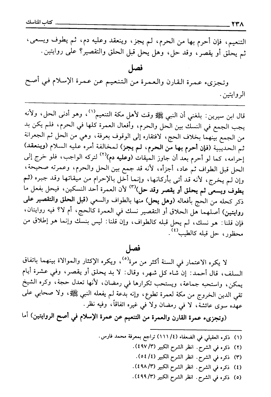 فَصْلٌ لَا يُكْرَهُ الِاعْتِمَارُ فِي السَّنَةِ أَكْثَرَ مِنْ مَرَّةٍ، وَيُكْرَهُ الْإِكْثَارُ، وَالْمُوَالَاةُ بَيْنَهُمَا بِاتِّفَاقِ السَّلَفِ قَالَ أَحْمَدُ: إِنْ شَاءَ كُلَّ شَهْرٍ، وَقَالَ لَا بُدَّ يَحْلِقَ أَوْ يُقَصِّرَ، وَفِي عَشَرَةِ أَيَّامٍ يُمْكِنُ، وَاسْتَحَبَّهُ جَمَاعَةٌ، وَيُسْتَحَبُّ تَكْرَارَهَا فِي رَمَضَانَ؛ لِأَنَّهَا تَعْدِلُ حَجَّةً، وَكَرِهَ الشَّيْخُ تَقِيُّ الدِّينِ الْخُرُوجَ مِنْ مَكَّةَ لِعُمْرَةِ تَطَوُّعٍ، وَإِنَّهُ بِدْعَةٌ لَمْ يَفْعَلْهُ النَّبِيُّ - صَلَّى اللَّهُ عَلَيْهِ وَسَلَّمَ -، وَلَا صَحَابِيٌّ عَلَى عَهْدِهِ سِوَى عَائِشَةَ، لَا فِي رَمَضَانَ، وَلَا فِي غَيْرِهِ اتِّفَاقًا، وَفِيهِ نَظَرٌ.