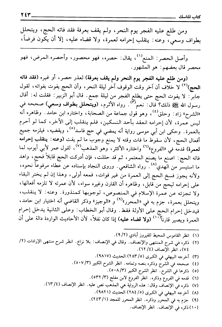 (وَمَنْ طَلَعَ عَلَيْهِ الْفَجْرُ يَوْمَ النَّحْرِ وَلَمْ يَقِفْ بِعَرَفَةَ) لِعُذْرِ حَصْرٍ، أَوْ غَيْرِهِ (فَقَدْ فَاتَهُ الْحَجُّ) لَا خِلَافَ أَنَّ آخِرَ وَقْتِ الْوُقُوفِ آخِرُ لَيْلَةِ النَّحْرِ، وَأَنَّ الْحَجَّ يَفُوتُ بِفَوَاتِهِ لِقَوْلِ جَابِرٍ: «لَا يَفُوتُ الْحَجُّ حَتَّى يطلع الْفَجْر مِنْ لَيْلَةِ جَمْعٍ. قَالَ أَبُو الزُّبَيْرِ: فَقُلْتُ لَهُ: أَقَالَ رَسُولُ اللَّهِ - صَلَّى اللَّهُ عَلَيْهِ وَسَلَّمَ - ذَلِكَ؟ قَالَ: نَعَمْ» . رَوَاهُ الْأَثْرَمُ.