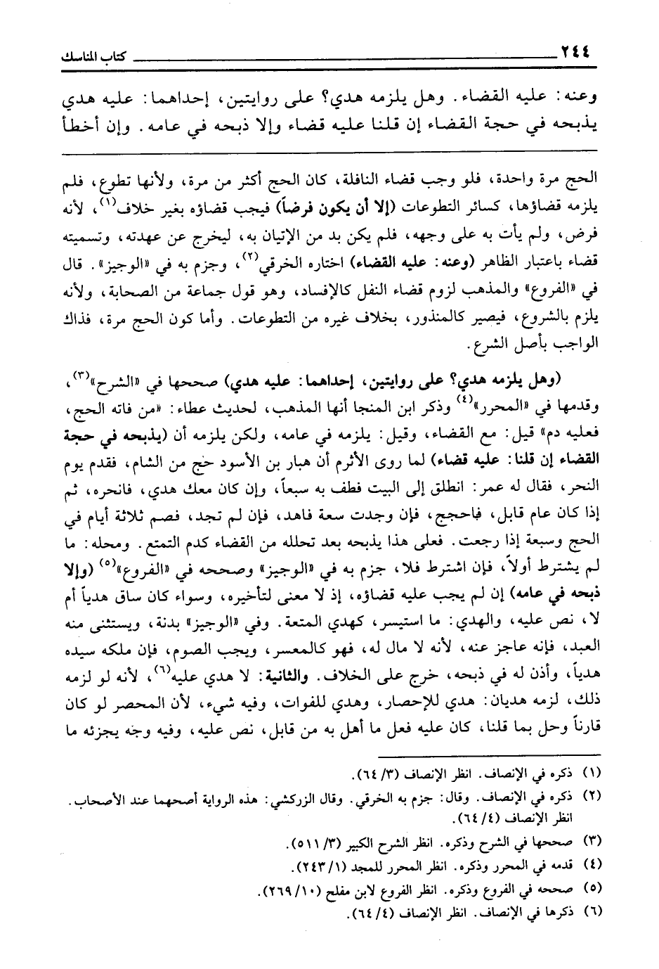 (وَهَلْ يَلْزَمُهُ هَدْيٌ؛ عَلَى رِوَايَتَيْنِ، إِحْدَاهُمَا: عَلَيْهِ هَدْيٌ) صَحَّحَهَا فِي " الشَّرْحِ " وَقَدَّمَهَا فِي " الْمُحَرَّرِ " وَذَكَرَ ابْنُ الْمُنَجَّا أَنَّهَا الْمَذْهَبُ لِحَدِيثِ عَطَاءٍ: «مَنْ فَاتَهُ الْحَجُّ فَعَلَيْهِ دَمٌ» قِيلَ: مَعَ الْقَضَاءِ، وَقِيلَ: يَلْزَمُهُ فِي عَامِهِ، وَلَكِنْ يَلْزَمُهُ أَنْ (يَذْبَحَهُ فِي حَجَّةِ الْقَضَاءِ إِنْ قُلْنَا: عَلَيْهِ قَضَاءٌ) لِمَا رَوَى الْأَثْرَمُ أَنَّ هَبَّارَ بْنَ الْأَسْوَدِ حَجَّ مِنَ الشَّامِ فَقَدِمَ يَوْمَ النَّحْرِ، فَقَالَ لَهُ عُمَرُ: انْطَلِقْ إِلَى الْبَيْتِ فَطُفْ بِهِ سَبْعًا، وَإِنْ كَانَ مَعَكَ هَدْيٌ فَانْحَرْهُ، ثُمَّ إِذَا كَانَ عَامُ قَابِلٍ فَاحْجُجْ، فَإِنْ وَجَدْتَ سَعَةً فَاهْدِ، فَإِنْ لَمْ تَجِدْ فَصُمْ ثَلَاثَةَ أَيَّامٍ فِي الْحَجِّ، وَسَبْعَةً إِذَا رَجَعْتَ فَعَلَى هَذَا يَذْبَحُهُ بَعْدَ تَحَلُّلِهِ مِنَ الْقَضَاءِ كَدَمِ التَّمَتُّعِ. ومَحَلُّهُ: مَا لَمْ يَشْتَرِطْ أَوَّلًا، فَإِنِ اشْتَرَطَ فَلَا جَزْمَ بِهِ فِي " الْوَجِيزِ " وَصَحَّحَهُ فِي " الْفُرُوعِ " (وَإِلَّا ذَبَحَهُ فِي عَامِهِ) إِنْ لَمْ يَجِبْ عَلَيْهِ قَضَاؤُهُ، إِذْ لَا مَعْنَى لِتَأْخِيرِهِ، وَسَوَاءٌ كَانَ سَاقَ هَدْيًا أَمْ لَا، نَصَّ عَلَيْهِ، وَالْهَدْيُ: مَا اسْتَيْسَرَ كَهَدْيِ الْمُتْعَةِ، وَفِي " الْوَجِيزِ " بَدَنَةٌ، وَيُسْتَثْنَى مِنْهُ الْعَبْدُ فَإِنَّهُ عَاجِزٌ عَنْهُ؛ لِأَنَّهُ لَا مَالَ لَهُ، فَهُوَ كَالْمُعْسِرِ، وَيَجِبُ الصَّوْمُ، فَإِنْ مَلَّكَهُ سَيِّدُهُ هَدْيًا، وَأَذِنَ لَهُ فِي ذَبْحِهِ، خَرَجَ عَلَى الْخِلَافِ، وَالثَّانِيَةُ: لَا هَدْيَ عَلَيْهِ؛ لِأَنَّهُ لَوْ لَزِمَهُ ذَلِكَ لَزِمَهُ هَدْيَانِ: هَدْيٌ لِلْإِحْصَارِ، وَهَدْيٌ لِلْفَوَاتِ، وَفِيهِ شَيْءٌ؛ لِأَنَّ الْمُحْصَرَ لَوْ كَانَ قَارِنًا، وَحَلَّ بِمَا قُلْنَا كَانَ عَلَيْهِ فِعْلُ مَا أَهَلَّ بِهِ مِنْ قَابِلٍ، نَصَّ عَلَيْهِ، وَفِيهِ وَجْهٌ يُجْزِئُهُ مَا