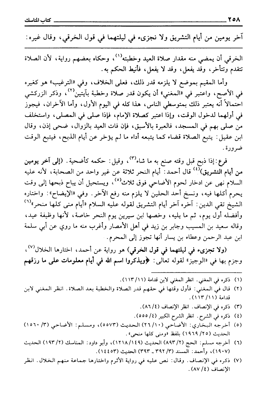 ـــــــــــــــــــــــــــــQالْخِرَقِيُّ أَنْ يَمْضِيَ مِنْهُ مِقْدَارُ صَلَاةِ الْعِيدِ وَخُطْبَتُهُ، وَحَكَاهُ بَعْضُهُمْ رِوَايَةً؛ لِأَنَّ الصَّلَاةَ تَتَقَدَّمُ وَتَتَأَخَّرُ، وَقَدْ يَفْعَلُ، وَقَدْ لَا يَفْعَلُ فَأُنِيطَ الْحُكْمُ بِهِ، وَأَمَّا الْمُقِيمُ بِمَوْضِعٍ لَا يَلْزَمُهُ قَدْرُ ذَلِكَ، فَعَلَى الْخِلَافِ، وَفِي " التَّرْغِيبِ " هُوَ كَغَيْرِهِ فِي الْأَصَحِّ، وَاعْتَبَرَ فِي " الْمُغْنِي " أَنْ يَكُونَ قَدْرَ صَلَاةٍ وَخُطْبَةٍ بِآيَتَيْنِ، وَذَكَرَ الزَّرْكَشِيُّ احْتِمَالًا أَنَّهُ يُعْتَبَرُ ذَلِكَ بِمُتَوَسِّطِي النَّاسِ هَذَا كُلُّهُ فِي الْيَوْمِ الْأَوَّلِ، وَأَمَّا الْآخَرَانِ فَيَجُوزُ فِي أَوَّلِهِمَا لِدُخُولِ الْوَقْتِ، وَإِذَا اعْتُبِرَ كَصَلَاةِ الْإِمَامِ فَإِذَا صَلَّى فِي الْمُصَلَّى، وَاسْتَخْلَفَ مَنْ صَلَّى بِهِمْ فِي الْمَسْجِدِ فَالْعِبْرَةُ بِالْأَسْبَقِ، فَإِنْ فَاتَ الْعِيدُ بِالزَّوَالِ، ضَحَّى إِذَنْ، وَقَالَ ابْنُ عَقِيلٍ: يَتْبَعُ الصَّلَاةَ قَضَاءً كَمَا يَتْبَعُهُ أَدَاءً مَا لَمْ يُؤَخَّرْ عَنْ أَيَّامِ الذَّبْحِ، فَيَتْبَعُ الْوَقْتَ ضَرُورَةً.