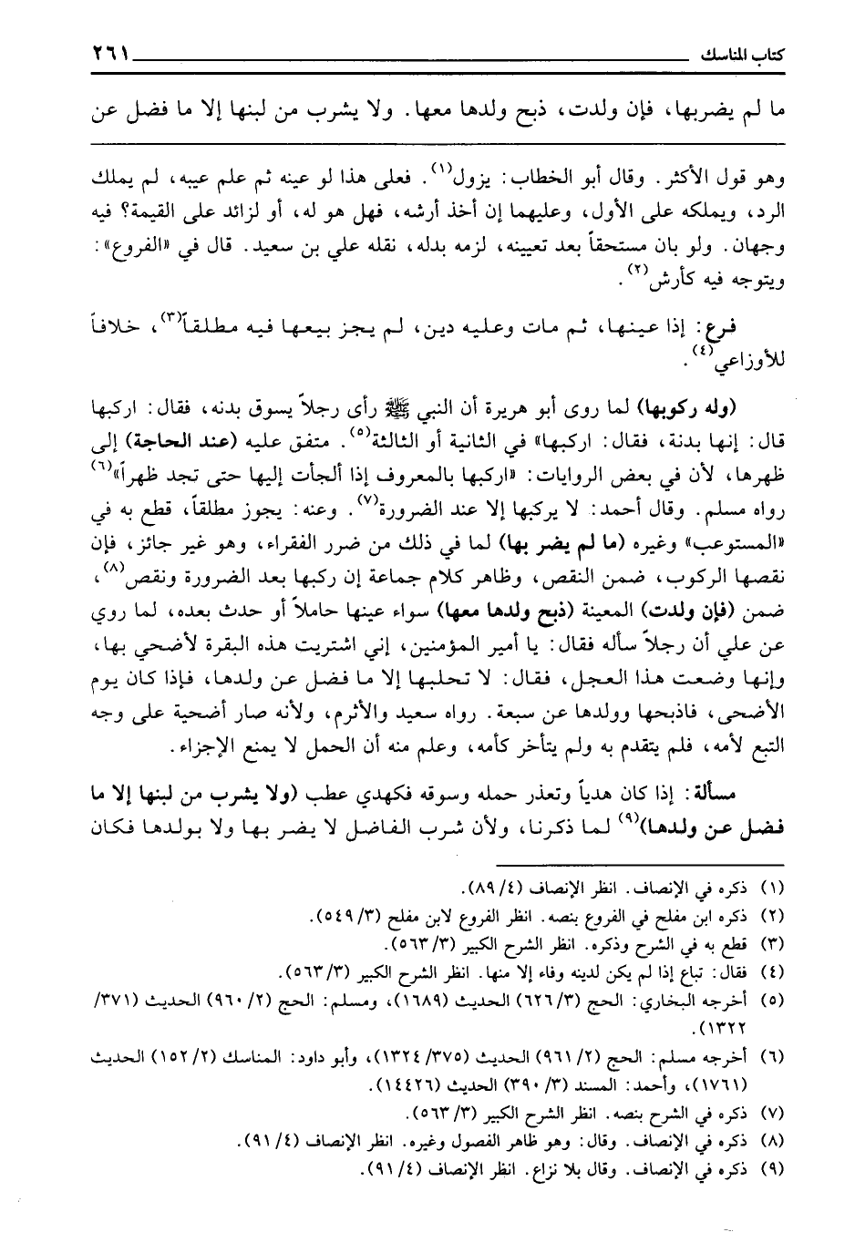 (وَلَهُ رُكُوبُهَا) لِمَا رَوَى أَبُو هُرَيْرَةَ أَنَّ النَّبِيَّ - صَلَّى اللَّهُ عَلَيْهِ وَسَلَّمَ - «رَأَى رَجُلًا يَسُوقُ بَدَنَةً فَقَالَ: ارْكَبْهَا، قَالَ: إِنَّهَا بَدَنَةٌ، فَقَالَ: ارْكَبْهَا " فِي الثَّانِيَةِ أَوِ الثَّالِثَةِ» . مُتَّفَقٌ عَلَيْهِ. (عِنْدَ الْحَاجَةِ) إِلَى ظَهْرِهَا؛ لِأَنَّ فِي بَعْضِ الرِّوَايَاتِ: «ارْكَبْهَا بِالْمَعْرُوفِ إِذَا أُلْجِئْتَ إِلَيْهَا حَتَّى تَجِدَ ظَهْرًا» . رَوَاهُ مُسْلِمٌ، وَقَالَ أَحْمَدُ: لَا يَرْكَبُهَا إِلَّا عِنْدَ الضَّرُورَةِ، وَعَنْهُ: يَجُوزُ مُطْلَقًا قَطَعَ بِهِ فِي " الْمُسْتَوْعِبِ " وَغَيْرِهِ (مَا لَمْ يَضُرَّ بِهَا) لِمَا فِي ذَلِكَ مِنْ ضَرَرِ الْفُقَرَاءِ وَهُوَ غَيْرُ جَائِزٍ، فَإِنْ نَقَصَهَا الرُّكُوبُ ضَمِنَ النَّقْصَ. وَظَاهِرُ كَلَامِ جَمَاعَةٍ إِنْ رَكِبَهَا بَعْدَ الضَّرُورَةِ وَنَقَصَ، ضَمِنَ (فَإِنْ وَلَدَتْ) الْمُعَيَّنَةُ (ذَبَحَ وَلَدَهَا مَعَهَا) سَوَاءٌ عَيَّنَهَا حَامِلًا أَوْ حَدَثَ بَعْدَهُ، لِمَا رُوِيَ عَنْ عَلِيٍّ أَنَّ رَجُلًا سَأَلَهُ فَقَالَ: يَا أَمِيرَ الْمُؤْمِنِينَ، إِنِّي اشْتَرَيْتُ هَذِهِ الْبَقَرَةَ لِأُضَحِّيَ بِهَا، وَإِنَّهَا وَضَعَتْ هَذَا الْعِجْلَ فَقَالَ: لَا تَحْلُبْهَا إِلَّا مَا فَضَلَ عَنْ وَلَدِهَا، فَإِذَا كَانَ يَوْمُ الْأَضْحَى فَاذْبَحْهَا وَوَلَدَهَا عَنْ سَبْعَةٍ. رَوَاهُ سَعِيدٌ وَالْأَثْرَمُ، وَلِأَنَّهُ صَارَ أُضْحِيَةً عَلَى وَجْهِ التَّبَعِ لِأُمِّهِ، فَلَمْ يَتَقَدَّمْ بِهِ، وَلَمْ يَتَأَخَّرْ كَأُمِّهِ، وَعُلِمَ مِنْهُ أَنَّ الْحَمْلَ لَا يَمْنَعُ الْإِجْزَاءَ.