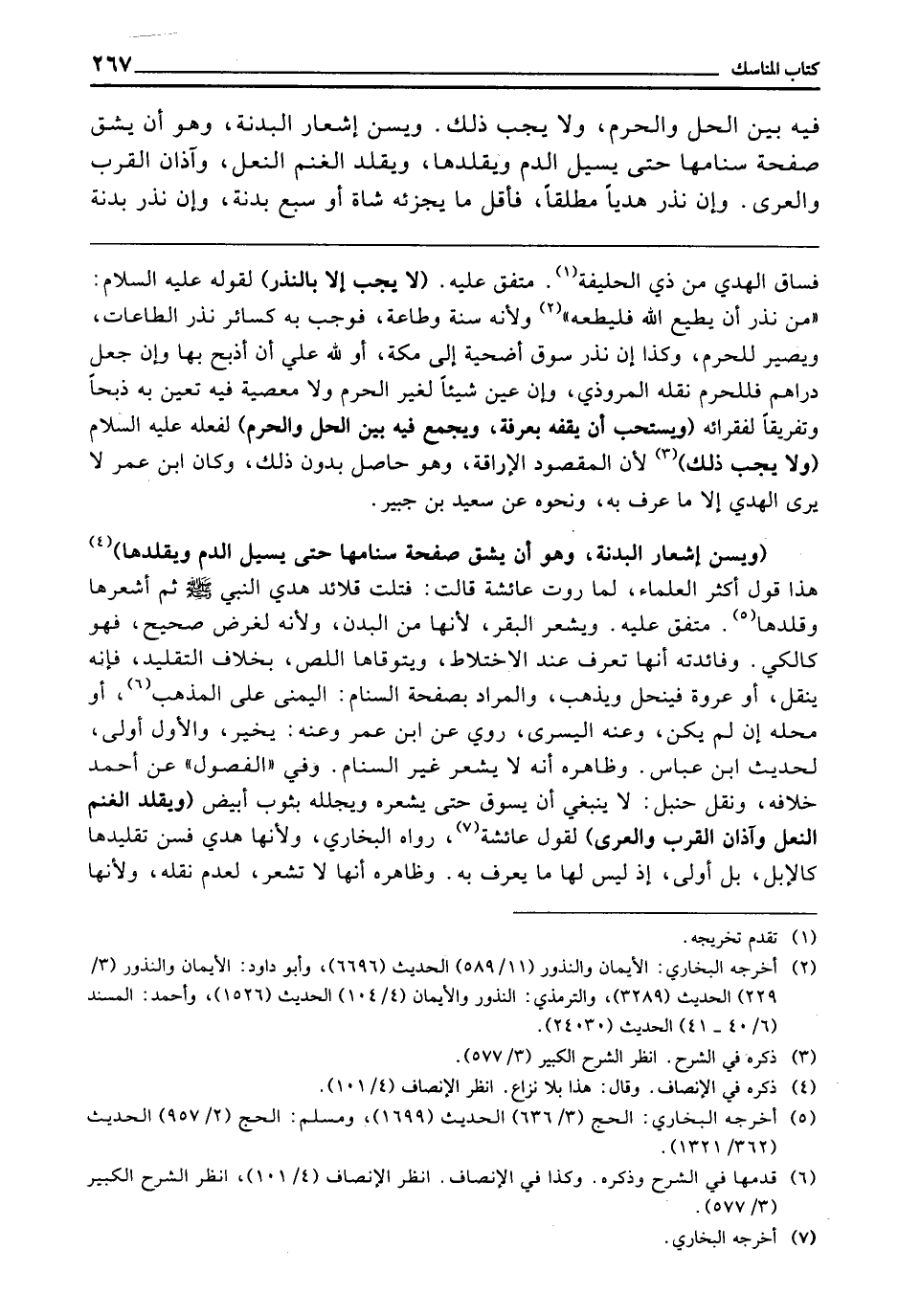 فِيهِ بَيْنَ الْحِلِّ وَالْحَرَمِ، وَلَا يَجِبُ ذَلِكَ. وَيُسَنُّ إِشْعَارُ الْبَدَنَةِ، وَهُوَ أَنْ يَشُقَّ صَفْحَةَ سَنَامِهَا حَتَّى يَسِيلَ الدَّمُ وَيُقَلِّدَهَا، وَيُقَلِّدَ الْغَنَمَ النَّعْلَ، وَآذَانَ الْقِرَبِ، وَالْعُرَى.