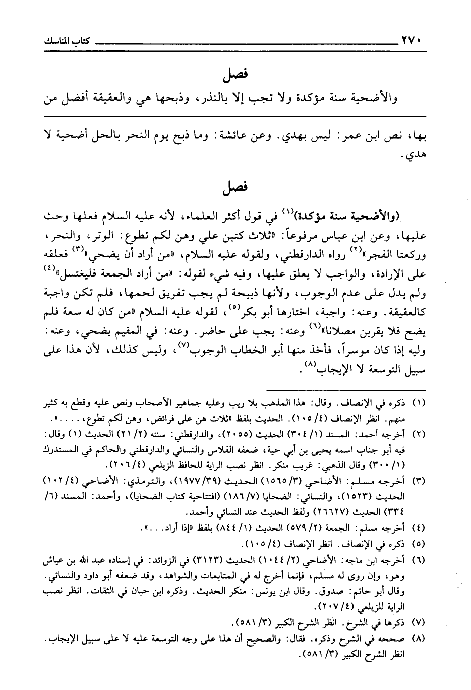 فَصْلٌ (وَالْأُضْحِيَّةُ سُنَّةٌ مُؤَكَّدَةٌ) فِي قَوْلِ أَكْثَرِ الْعُلَمَاءِ؛ لِأَنَّهُ - عَلَيْهِ السَّلَامُ - فَعَلَهَا، وَحَثَّ عَلَيْهَا، وَعَنِ ابْنِ عَبَّاسٍ مَرْفُوعًا: «ثَلَاثٌ كُتِبْنَ عَلَيَّ وَهُنَّ لَكُمْ تَطَوُّعٌ: الْوِتْرِ، وَالنَّحْرُ، وَرَكْعَتَا الْفَجْرِ» . رَوَاهُ الدَّارَقُطْنِيُّ. وَلِقَوْلِهِ - عَلَيْهِ السَّلَامُ - «مَنْ أَرَادَ أَنْ يُضَحِّيَ» .