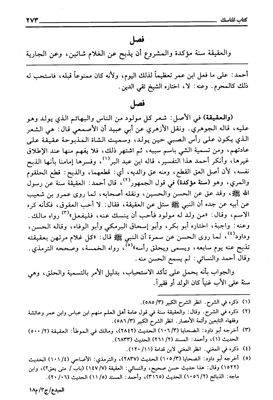 فَصْلٌ (وَالْعَقِيقَةُ) فِي الْأَصْلِ: شَعَرُ كُلِّ مَوْلُودٍ مِنَ النَّاسِ وَالْبَهَائِمِ الَّذِي يُولَدُ وَهُوَ عَلَيْهِ، قَالَهُ الْجَوْهَرِيُّ. وَنَقَلَ الْأَزْهَرِيُّ عَنْ أَبِي عُبَيْدٍ أَنَّ الْأَصْمَعِيَّ قَالَ: هِيَ الشَّعَرُ الَّذِي يَكُونُ عَلَى رَأْسِ الصَّبِيِّ حِينَ يُولَدُ، وَسُمِّيَتِ الشَّاةُ الْمَذْبُوحَةُ عَقِيقَةً عَلَى عَادَتِهِمْ، ومِنْ تَسْمِيَةِ الشَّيْءِ بِاسْمِ سَبَبِهِ. ثُمَّ اشْتُهِرَ ذَلِكَ، فَلَا يُفْهَمُ مِنْهَا عِنْدَ الْإِطْلَاقِ غَيْرُهَا، وَأَنْكَرَ أَحْمَدُ هَذَا التَّفْسِيرَ. قَالَهُ ابْنُ عَبْدِ الْبَرِّ، وَفَسَّرَهَا إِمَامُنَا بِأَنَّهَا الذَّبْحُ نَفْسُهُ؛ لِأَنَّ أَصْلَ الْعَقِّ الْقَطْعُ، وَمِنْهُ عَقَّ وَالِدَيْهِ أَيْ: قَطَعَهُمَا، وَالذَّبْحُ: قَطْعُ الْحُلْقُومِ، وَالْمَرِّيُّ، وَهُوَ (سُنَّةٌ مُؤَكَّدَةٌ) فِي قَوْلِ الْجُمْهُورِ. قَالَ أَحْمَدُ: الْعَقِيقَةُ سُنَّةٌ عَنْ رَسُولِ اللَّهِ - صَلَّى اللَّهُ عَلَيْهِ وَسَلَّمَ - وَقَدْ عَقَّ عَنْ الْحَسَنِ وَالْحُسَيْنِ، وَنَقَلَهُ أَصْحَابُهُ لِمَا رَوَى عَمْرُو بْنُ شُعَيْبٍ عَنْ أَبِيهِ عَنْ جَدِّهِ «أَنَّ النَّبِيَّ - صَلَّى اللَّهُ عَلَيْهِ وَسَلَّمَ - سُئِلَ عَنِ الْعَقِيقَةِ فَقَالَ: لَا أُحِبُّ الْعُقُوقَ، فَكَأَنَّهُ كَرِهَ الِاسْمَ، وَقَالَ: مَنْ وُلِدَ لَهُ مَوْلُودٌ فَأَحَبَّ أَنْ يَنْسِكَ عَنْهُ فَلْيَفْعَلْ.» رَوَاهُ مَالِكٌ، وَعَنْهُ: وَاجِبَةٌ، اخْتَارَهُ أَبُو بَكْرٍ، وَأَبُو إِسْحَاقَ الْبَرْمَكِيُّ وَأَبُو الْوَفَاءِ، وَقَالَهُ الْحَسَنُ، وَدَاوُدُ، لِمَا رَوَى الْحَسَنُ عَنْ سَمُرَةَ أَنَّ النَّبِيَّ - صَلَّى اللَّهُ عَلَيْهِ وَسَلَّمَ - قَالَ: «كُلُّ غُلَامٍ مُرْتَهَنٍ بِعَقِيقَتِهِ تُذْبَحُ عَنْهُ يَوْمَ سَابِعِهِ وَيُسَمَّى وَيُحْلَقُ رَأْسُهُ» . رَوَاهُ الْخَمْسَةُ، وَصَحَّحَهُ التِّرْمِذِيُّ، وَقَالَ أَحْمَدُ وَالنَّسَائِيُّ: لَمْ يَسْمَعِ الْحَسَنُ مِنْهُ.
