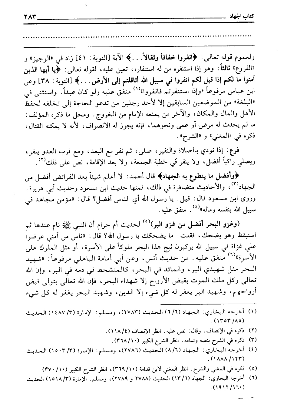 ـــــــــــــــــــــــــــــQوَلِعُمُومِ قَوْله تَعَالَى: {انْفِرُوا خِفَافًا وَثِقَالا} [التوبة: 41] الْآيَةَ زَادَ فِي " الْوَجِيزِ " وَ " الْفُرُوعِ " ثَالِثًا، وَهُوَ إِذَا اسْتَنْفَرَهُ مِنْ لَهُ اسْتِنْفَارُهُ، تَعَيَّنَ عَلَيْهِ، لِقَوْلِهِ تَعَالَى: {يَا أَيُّهَا الَّذِينَ آمَنُوا مَا لَكُمْ إِذَا قِيلَ لَكُمُ انْفِرُوا فِي سَبِيلِ اللَّهِ اثَّاقَلْتُمْ إِلَى الأَرْضِ} [التوبة: 38] . وَعَنِ ابْنِ عَبَّاسٍ مَرْفُوعًا: «وَإِذَا اسْتُنْفِرْتُمْ فَانْفِرُوا» . مُتَّفَقٌ عَلَيْهِ. وَلَوْ كَانَ عَبْدًا. وَاسْتَثْنَى فِي " الْبُلْغَةِ " مِنَ الْمَوْضِعَيْنِ السَّابِقَيْنِ إِلَّا لِأَحَدِ رَجُلَيْنِ: مَنْ تَدْعُو الْحَاجَةُ إِلَى تَخَلُّفِهِ لِحِفْظِ الْأَهْلِ وَالْمَالِ وَالْمَكَانِ، وَالْآخَرُ مَنْ يَمْنَعُهُ الْإِمَامُ مِنَ الْخُرُوجِ، وَمَحَلُّ مَا ذَكَرَهُ الْمُؤَلِّفُ: مَا لَمْ يَحْدُثْ لَهُ مَرَضٌ أَوْ عَمًى وَنَحْوُهُمَا، فَإِنَّهُ يَجُوزُ لَهُ الِانْصِرَافُ؛ لِأَنَّهُ لَا يُمْكِنُهُ الْقِتَالُ. ذَكَرَهُ فِي " الْمُغْنِي " وَ " الشَّرْحِ ".