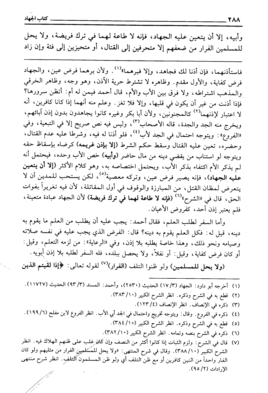 ـــــــــــــــــــــــــــــQفَاسْتَأْذِنْهُمَا فَإِنْ أَذِنَا لَكَ فَجَاهِدْ، وَإِلَّا فَبِرُّهُمَا» ، وَلِأَنَّ بِرَّهُمَا فَرْضُ عَيْنٍ وَالْجِهَادَ فَرْضُ كِفَايَةٍ، وَالْأَوَّلُ مُقَدَّمٌ. وَظَاهِرُهُ لَا تُشْتَرَطُ حُرِّيَّةُ الْآذِنِ، وَهُوَ وَجْهٌ. وَظَاهِرُ الْخِرَقِيِّ، وَالْمَذْهَبِ اشْتِرَاطُهُ. وَلَا فَرْقَ بَيْنَ الْأَبِ وَالْأُمِّ. قَالَ أَحْمَدُ فِيمَنْ لَهُ أُمٌّ: أَتَظُنُّ سُرُورَهَا؛ فَإِذَا أَذِنَتْ مِنْ غَيْرِ أَنْ يَكُونَ فِي قَلْبِهَا، وَإِلَّا فَلَا تَغْزُ، وَعُلِمَ مِنْهُ أَنَّهُمَا إِذَا كَانَا كَافِرَيْنِ، أَنَّهُ لَا اعْتِبَارَ لِإِذْنِهِمَا كَالْمَجْنُونَيْنِ، وَلِأَنَّ أَبَا بَكْرٍ وَغَيْرَهُ كَانُوا يُجَاهِدُونَ بِدُونِ إِذْنِ آبَائِهِمْ، وَيَخْرُجُ مِنْهُ الْجَدُّ وَالْجَدَّةُ، قَالَهُ الْأَصْحَابُ، وَلَيْسَ فِيهِ نَصٌّ صَرِيحٌ إِلَّا فِي الْعُتْبِيَّةِ. وَفِي " الْفُرُوعِ ": وَيَتَوَجَّهُ احْتِمَالٌ فِي الْجِدِّ لِأَبٍ، فَلَوْ أَذِنَا لَهُ فِيهِ، وَشَرَطَا عَلَيْهِ عَدَمَ الْقِتَالِ وَحَضَرَهُ تَعَيَّنَ عَلَيْهِ الْقِتَالُ، وَسَقَطَ حُكْمُ الشَّرْطِ (إِلَّا بِإِذْنِ غَرِيمِهِ) كَرِضَاهُ بِإِسْقَاطِ حَقِّهِ، وَيَتَوَجَّهُ لَوِ اسْتَنَابَ مَنْ يَقْضِي دَيْنَهُ مِنْ مَالٍ حَاضِرٍ. (وَأَبِيهِ) خَصَّ الْأَبَ وَحْدَهُ فَيُحْتَمَلُ أَنَّهُ لَمْ يَذْكُرِ الْأُمَّ اكْتِفَاءً بِذِكْرِ الْأَبِ، وَيُحْتَمَلُ اخْتِصَاصُهُ بِهِ، وَهُوَ كَلَامُ الْأَكْثَرِ (إِلَّا أَنْ يَتَعَيَّنَ عَلَيْهِ الْجِهَادُ) فَإِنَّهُ يَصِيرُ فَرْضَ عَيْنٍ وَتَرْكُهُ مَعْصِيَةً، لَكِنْ يُسْتَحَبُّ لِلْمَدِينِ أَنْ لَا يَتَعَرَّضَ لِمَظَانِّ الْقَتْلِ مِنَ الْمُبَارَزَةِ وَالْوُقُوفِ فِي أَوَّلِ الْمُقَاتِلَةِ؛ لِأَنَّ فِيهِ تَغْرِيرًا بِفَوَاتِ الْحَقِّ، قَالَهُ فِي " الشَّرْحِ " (فَإِنَّهُ لَا طَاعَةَ لَهُمَا فِي تَرْكِ فَرِيضَةٍ) لِأَنَّ الْجِهَادَ عِبَادَةٌ مُتَعَيِّنَةٌ فَلَمْ يُعْتَبَرْ إِذْنُ أَحَدٍ، كَفُرُوضِ الْأَعْيَانِ.