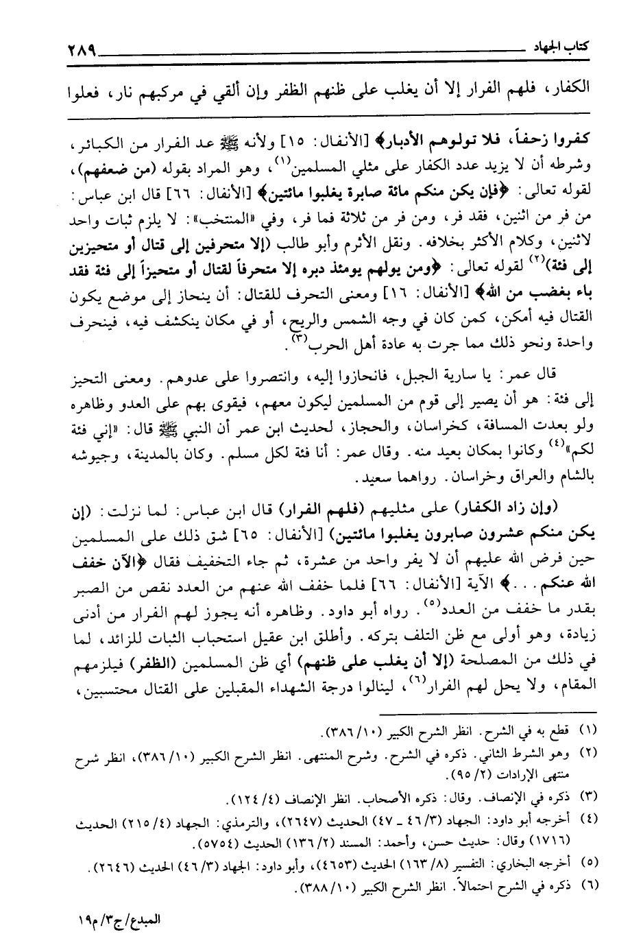 قَالَ: عُمَرُ يَا سَارِيَةُ الْجَبَلَ. فَانْحَازُوا إِلَيْهِ وَانْتَصَرُوا عَلَى عَدُوِّهِمْ، وَمَعْنَى التَّحَيُّزِ إِلَى فِئَةٍ: هُوَ أَنْ يَصِيرَ إِلَى قَوْمٍ مِنَ الْمُسْلِمِينَ لِيَكُونَ مَعَهُمْ، فَيَقْوَى بِهِمْ عَلَى الْعَدُوِّ. وَظَاهِرُهُ وَلَوْ بَعُدَتِ الْمَسَافَةُ، كَخُرَاسَانَ، وَالْحِجَازِ، لِحَدِيثِ ابْنِ عُمَرَ أَنَّ النَّبِيَّ - صَلَّى اللَّهُ عَلَيْهِ وَسَلَّمَ - قَالَ: «إِنِّي فِئَةٌ لَكُمْ» وَكَانُوا بِمَكَانٍ بَعِيدٍ مِنْهُ، وَقَالَ عُمَرُ: أَنَا فِئَةٌ لِكُلِّ مُسْلِمٍ، وَكَانَ بِالْمَدِينَةِ، وَجُيُوشُهُ بِالشَّامِ، وَالْعِرَاقِ، وَخُرَاسَانَ رَوَاهُمَا سَعِيدٌ.