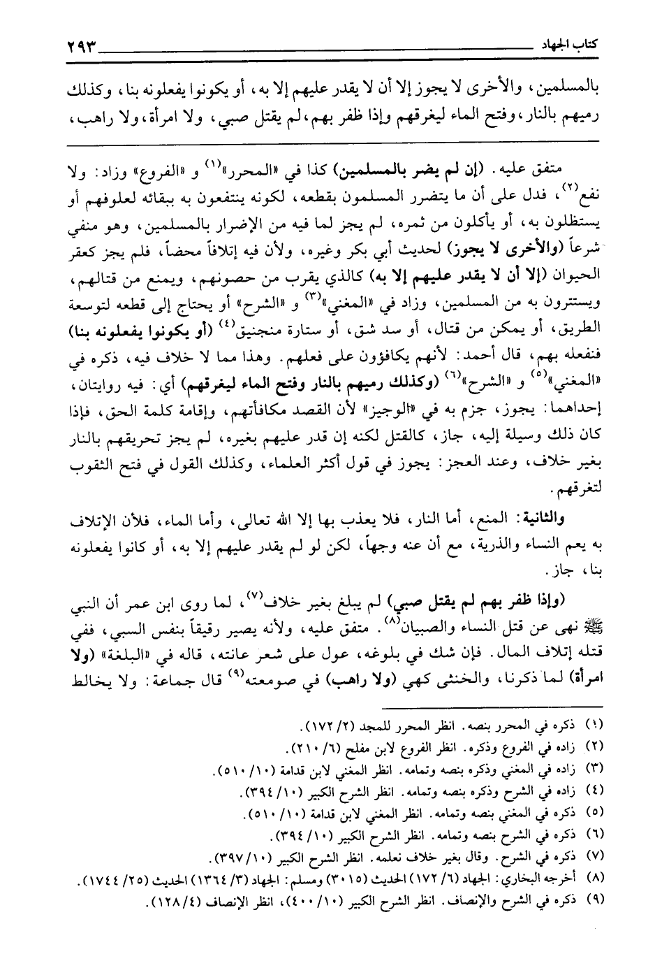 ـــــــــــــــــــــــــــــQمُتَّفَقٌ عَلَيْهِ. (إِنْ لَمْ يَضُرَّ بِالْمُسْلِمِينَ) كَذَا فِي " الْمُحَرَّرِ " وَ " الْفُرُوعِ " وَزَادَ: وَلَا نَفَعَ. فَدَلَّ عَلَى أَنَّ مَا يَتَضَرَّرُ الْمُسْلِمُونَ بِقَطْعِهِ لِكَوْنِهِ يَنْتَفِعُونَ بِهِ بِبَقَائِهِ لِعُلُوفِهِمْ أَوْ يَسْتَظِلُّونَ بِهِ أَوْ يَأْكُلُونَ مِنْ ثَمَرِهِ، لَمْ يَجُزْ لِمَا فِيهِ مِنَ الْإِضْرَارِ بِالْمُسْلِمِينَ، وَهُوَ مَنْفِيٌّ شَرْعًا (وَالْأُخْرَى لَا يَجُوزُ) لِحَدِيثِ أَبِي بَكْرٍ وَغَيْرِهِ، وَلِأَنَّ فِيهِ إِتْلَافًا مَحْضًا، فَلَمْ يَجُزْ كَعَقْرِ الْحَيَوَانِ (إِلَّا أَنْ لَا يَقْدِرَ عَلَيْهِمْ إِلَّا بِهِ) كَالَّذِي يَقْرُبُ مِنْ حُصُونِهِمْ، وَيَمْنَعُ مِنْ قِتَالِهِمْ، وَيَسْتَتِرُونَ بِهِ مِنَ الْمُسْلِمِينَ، وَزَادَ فِي " الْمُغْنِي " وَ " الشَّرْحِ " أَوْ يُحْتَاجُ إِلَى قَطْعِهِ لِتَوْسِعَةِ الطَّرِيقِ، أَوْ يُمَكِّنُ مِنْ قِتَالٍ، أَوْ سَدِّ شَقٍّ، أَوْ سِتَارَةِ مَنْجَنِيقٍ. (أَوْ يَكُونُوا يَفْعَلُونَهُ بِنَا) فَنَفْعَلُهُ بِهِمْ، قَالَ أَحْمَدُ: لِأَنَّهُمْ يُكَافَئُونَ عَلَى فِعْلِهِمْ. وَهَذَا مِمَّا لَا خِلَافَ فِيهِ. ذَكَرَهُ فِي " الْمُغْنِي " وَ " الشَّرْحِ " (وَكَذَلِكَ رَمْيُهُمْ بِالنَّارِ وَفَتْحُ الْمَاءِ لِيُغْرِقَهُمْ) أَيْ فِيهِ رِوَايَتَانِ، إِحْدَاهُمَا: يَجُوزُ؛ جَزَمَ بِهِ فِي " الْوَجِيزِ "؛ لِأَنَّ الْقَصْدَ مُكَافَأَتُهُمْ، وَإِقَامَةُ كَلِمَةِ الْحَقِّ، فَإِذَا كَانَ ذَلِكَ وَسِيلَةً إِلَيْهِ جَازَ كَالْقَتْلِ، لَكِنَّهُ إِنْ قَدَرَ عَلَيْهِمْ بِغَيْرِهِ، لَمْ يَجُزْ تَحْرِيقُهُمْ بِالنَّارِ بِغَيْرِ خِلَافٍ. وَعِنْدَ الْعَجْزِ: يَجُوزُ فِي قَوْلِ أَكْثَرِ الْعُلَمَاءِ، وَكَذَلِكَ الْقَوْلُ فِي فَتْحِ الثُّقُوبِ لِتَغْرِقهِمْ.