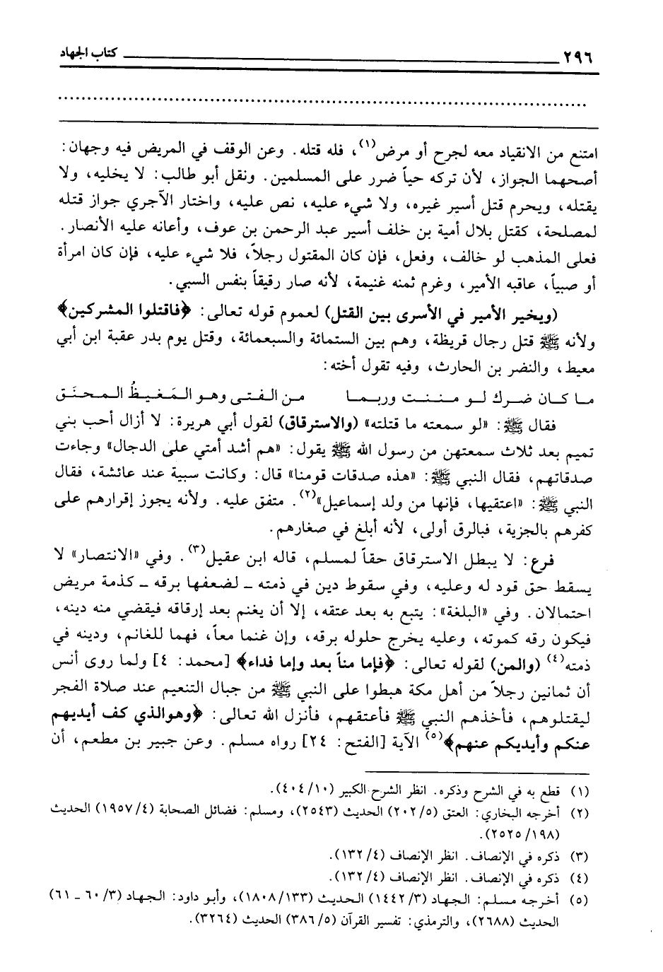 فَرْعٌ: لَا يُبْطِلُ الِاسْتِرْقَاقُ حَقًّا لِمُسْلِمٍ. قَالَهُ ابْنُ عَقِيلٍ. وَفِي " الِانْتِصَارِ " لَا يُسْقِطُ حَقَّ قَوْدٍ لَهُ وَعَلَيْهِ. وَفِي سُقُوطِ دَيْنٍ فِي ذِمَّتِهِ لِضَعْفِهَا بِرِقِّهِ كَذِمَّةِ مَرِيضٍ احْتِمَالَانِ. وَفِي " الْبُلْغَةِ ": يُتْبَعُ بِهِ بَعْدَ عِتْقِهِ إِلَّا أَنْ يَغْنَمَ بَعْدَ إِرْقَاقِهِ فَيَقْضِي مِنْهُ دَيْنَهُ فَيَكُونُ رِقُّهُ كَمَوْتِهِ؛ وَعَلَيْهِ يَخْرُجُ حُلُولُهُ بِرِقِّهِ، وَإِنْ غُنِمَا مَعًا فَهُمَا لِلْغَانِمِ، وَدَيْنُهُ فِي ذِمَّتِهِ. (وَالْمَنُّ) لِقَوْلِهِ تَعَالَى: {فَإِمَّا مَنًّا بَعْدُ وَإِمَّا فِدَاءً} [محمد: 4] وَلِمَا رَوَى أَنَسٌ «أَنَّ ثَمَانِينَ رَجُلًا مِنْ أَهْلِ مَكَّةَ هَبَطُوا عَلَى النَّبِيِّ - صَلَّى اللَّهُ عَلَيْهِ وَسَلَّمَ - مِنْ جِبَالِ التَّنْعِيمِ عِنْدَ صَلَاةِ الْفَجْرِ لِيَقْتُلُوهُمْ فَأَخَذَهُمُ النَّبِيُّ - صَلَّى اللَّهُ عَلَيْهِ وَسَلَّمَ - فَأَعْتَقَهُمْ فَأَنْزَلَ اللَّهُ تَعَالَى: {وَهُوَ الَّذِي كَفَّ أَيْدِيَهُمْ عَنْكُمْ وَأَيْدِيَكُمْ عَنْهُمْ} [الفتح: 24] الْآيَةَ.» رَوَاهُ مُسْلِمٌ. وَعَنْ جُبَيْرِ بْنِ مُطْعَمٍ أَنَّ