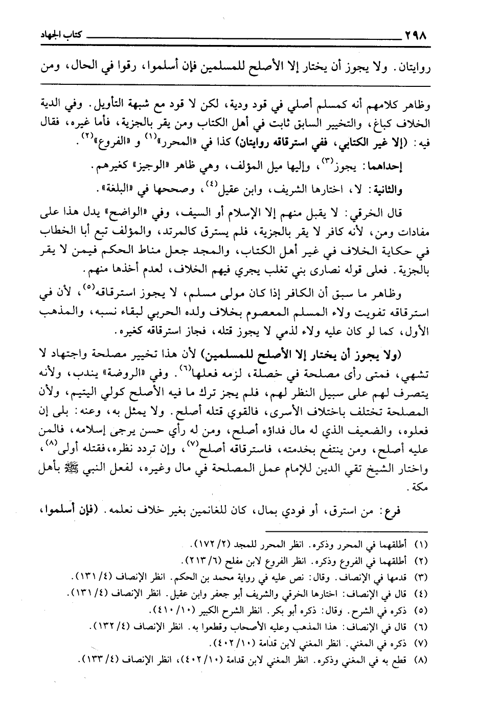 قَالَ الْخِرَقِيُّ: لَا يُقْبَلُ مِنْهُمْ إِلَّا الْإِسْلَامُ أَوِ السَّيْفُ، وَفِي " الْوَاضِحِ " يَدُلُّ هَذَا عَلَى مُفَادَاتٍ وَمَنٍّ؛ لِأَنَّهُ كَافِرٌ لَا يُقَرُّ بِالْجِزْيَةِ فَلَمْ يُسْتَرَقَّ كَالْمُرْتَدِّ، وَالْمُؤَلِّفُ تَبِعَ أَبَا الْخَطَّابِ فِي حِكَايَةِ الْخِلَافِ فِي غَيْرِ أَهْلِ الْكِتَابِ، وَالْمَجْدُ جَعَلَ مَنَاطَ الْحُكْمِ فِيمَنْ لَا يُقَرُّ بِالْجِزْيَةِ. فَعَلَى قَوْلِهِ نَصَارَى بَنِي تَغْلِبَ يَجْرِي فِيهِمُ الْخِلَافُ، لِعَدَمِ أَخْذِهَا مِنْهُمْ. وَظَاهِرُ مَا سَبَقَ أَنَّ الْكَافِرَ إِذَا كَانَ مَوْلَى مُسْلِمٍ لَا يَجُوزُ اسْتِرْقَاقُهُ؛ لِأَنَّ فِي اسْتِرْقَاقِهِ تَفْوِيتَ وَلَاءِ الْمُسْلِمِ الْمَعْصُومِ بِخِلَافِ وَلَدِهِ الْحَرْبِيِّ لِبَقَاءِ نَسَبِهِ. وَالْمَذْهَبُ الْأَوَّلُ كَمَا لَوْ كَانَ عَلَيْهِ وَلَاءٌ لِذِمِّيٍّ لَا يَجُوزُ قَتْلُهُ فَجَازَ اسْتِرْقَاقُهُ كَغَيْرِهِ.