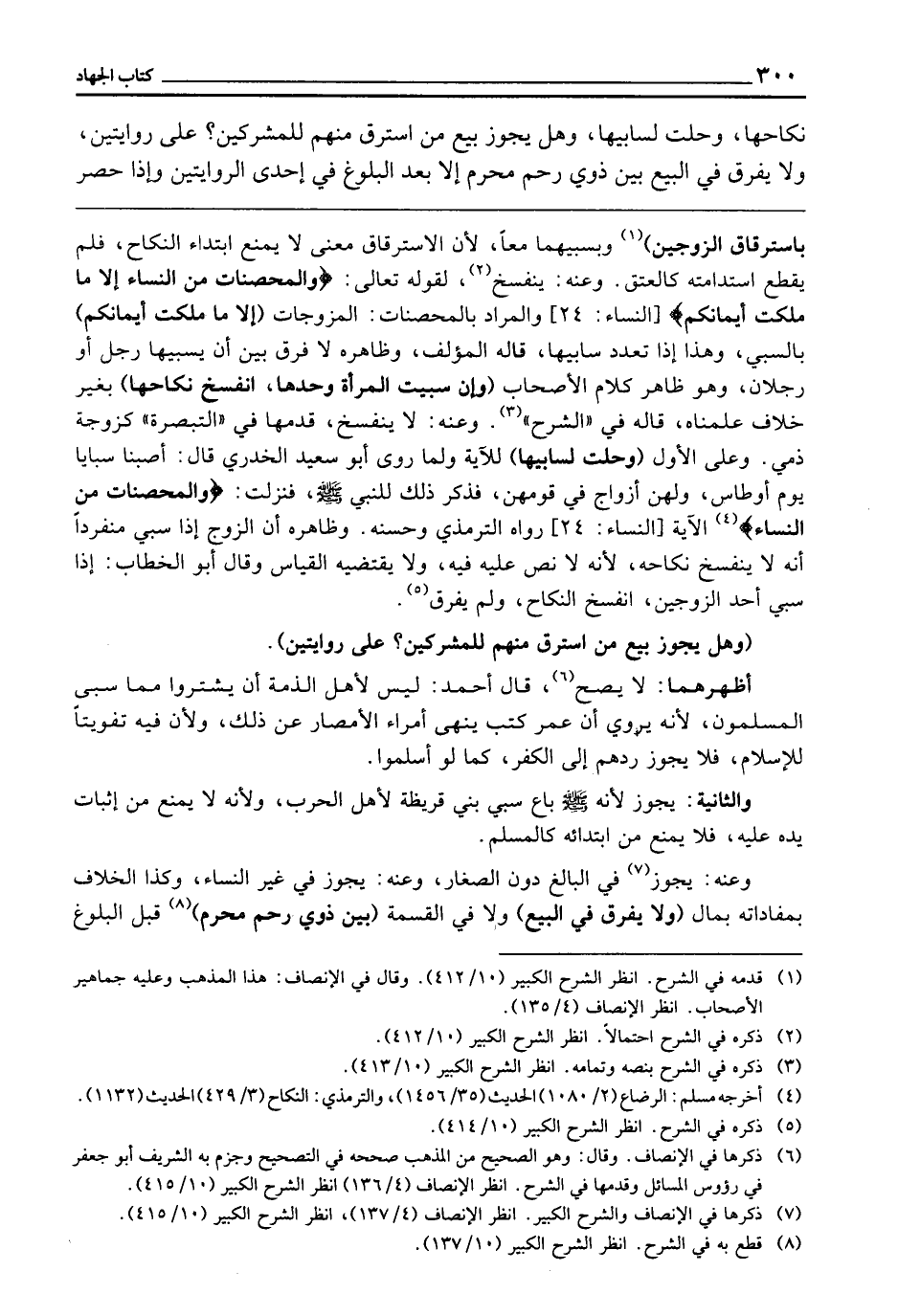 نِكَاحُهَا، وَحَلَّتْ لِسَابِيهَا. وَهَلْ يَجُوزُ بَيْعُ مَنِ اسْتُرِقَّ مِنْهُمْ لِلْمُشْرِكِينَ؟ عَلَى رِوَايَتَيْنِ، وَلَا يُفَرَّقُ فِي الْبَيْعِ بَيْنَ ذَوِي رَحِمٍ مُحَرَّمٍ إِلَّا بَعْدَ الْبُلُوغِ فِي إِحْدَى الرِّوَايَتَيْنِ وَإِذَا حَصَرَ