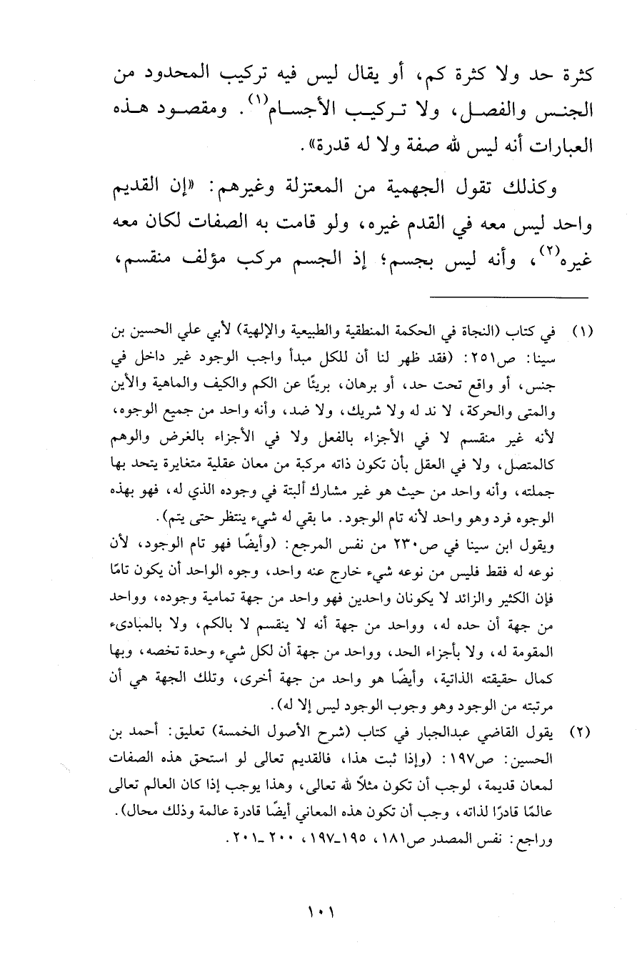 كثرة حد ولا كثرة كم أو يقال ليس فيه تركيب المحدود من الجنس والفصل ولا تركيب الأجسام ومقصود هذه العبارات أنه ليس لله صفة ولا له قدرة وكذلك تقول الجهمية من المعتزلة وغيرهم إن القديم واحد ليس معه في القدم غيره ولو قامت به الصفات لكان معه غيره وأنه ليس بجسم إذ الجسم مركب مؤلف منقسم
