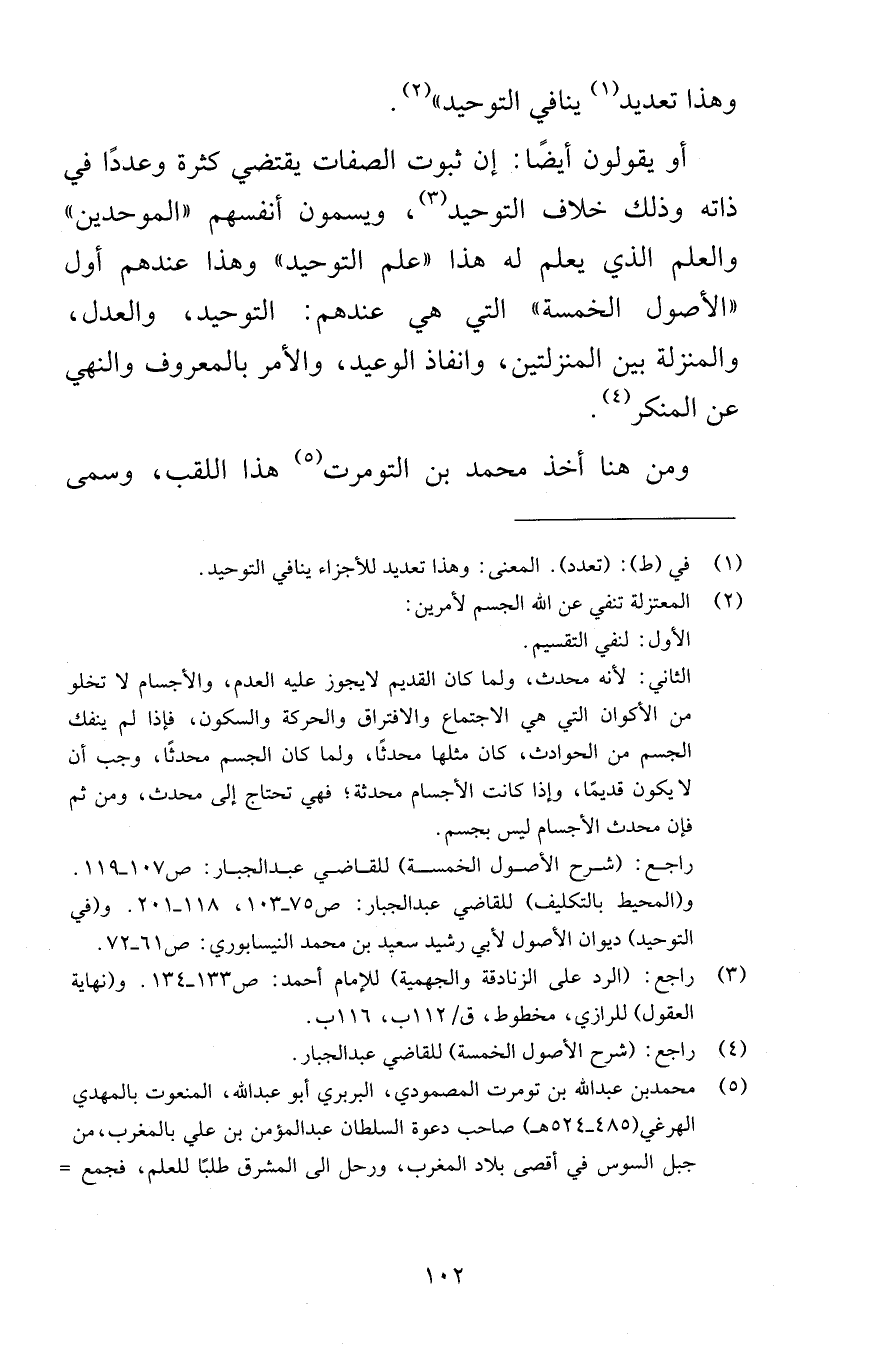 وهذا تعديد ينافي التوحيد أو يقولون أيضًا إن ثبوت الصفات يقتضي كثرة وعددًا في ذاته وذلك خلاف التوحيد ويسمون أنفسهم الموحدين والعلم الذي يعلم له هذا علم التوحيد وهذا عندهم أول الأصول الخمسة التي هي عندهم التوحيد والعدل والمنزلة بين المنزلتين وانفاذ الوعيد والأمر بالمعروف والنهي عن المنكر ومن هنا أخذ محمد بن التومرت هذا اللقب وسمى