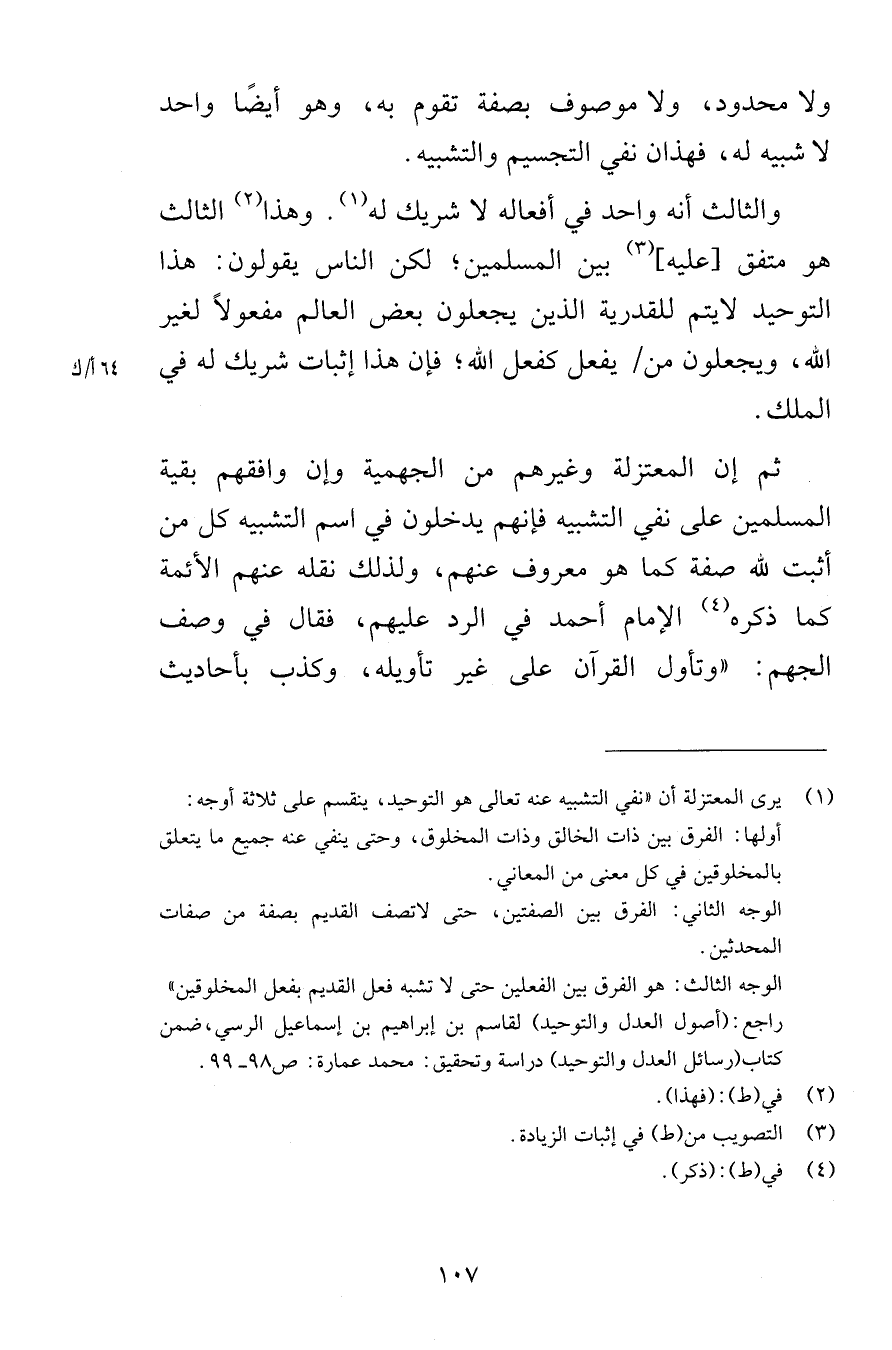 ولا محدود ولا موصوف بصفة تقوم به وهو أيضًا واحد لا شبيه له فهذان نفي التجسيم والتشبيه والثالث أنه واحد في أفعاله لا شريك له وهذا الثالث هو متفق عليه بين المسلمين لكن الناس يقولون هذا التوحيد لايتم للقدرية الذين يجعلون بعض العالم مفعولاً لغير الله ويجعلون من يفعل كفعل الله فإن هذا إثبات شريك له في الملك ثم إن المعتزلة وغيرهم من الجهمية وإن وافقهم بقية المسلمين على نفي التشبيه فإنهم يدخلون في اسم التشبيه كل من أثبت لله صفة كما هو معروف عنهم ولذلك نقله عنهم الأئمة كما ذكره الإمام أحمد في الرد عليهم فقال في وصف الجهم وتأول القرآن على غير تأويله وكذب بأحاديث