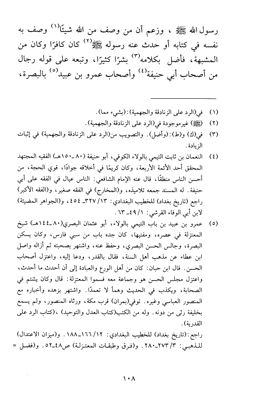 رسول الله صلى الله عليه وسلم وزعم أن من وصف من الله شيئًا وصف به نفسه في كتابه أو حدث عنه رسوله صلى الله عليه وسلم كان كافرًا وكان من المشبهة فأضل بكلامه بشرًا كثرًا وتبعه على قوله رجال من أصحاب أبي حنيفة وأصحاب عمرو بن عبيد بالبصرة