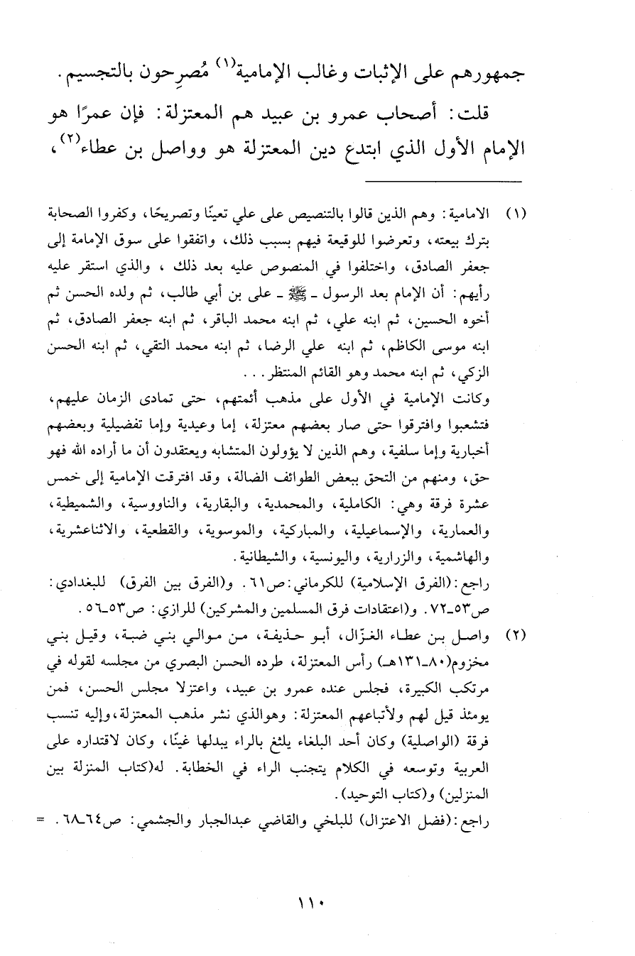 جمهورهم على الإثبات وغالب الإمامية مُصرِحون بالتجسيم قلت أصحاب عمرو بن عبيد هم المعتزلة فإن عمرًا هو الإمام الأول الذي ابتدع دين المعتزلة هو وواصل بن عطاء