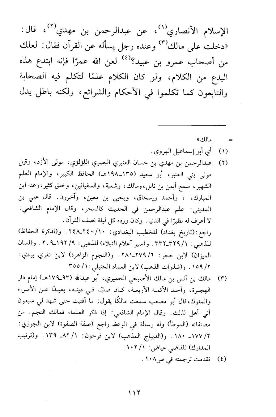 الإسلام الأنصاري عن عبد الرحمن بن مهدي قال دخلت على مالك وعنده رجل يسأله عن القرآن فقال لعلك من أصحاب عمرو بن عبيد لعن الله عمرًا فإنه ابتدع هذه البدع من الكلام ولو كان الكلام علمًا لتكلم فيه الصحابة والتابعون كما تكلموا في الأحكام والشرائع ولكنه باطل يدل