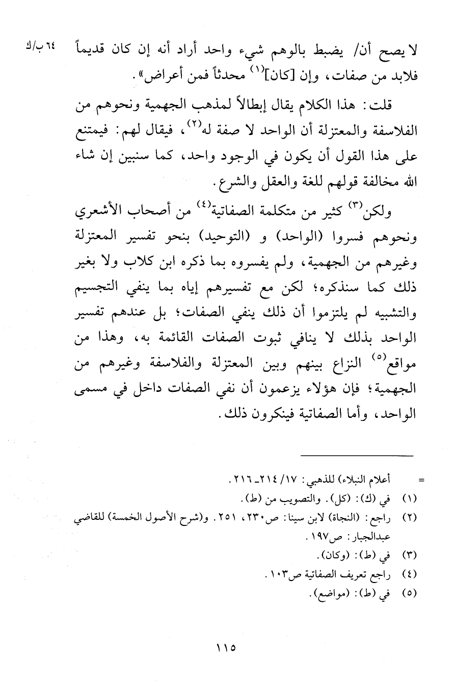لا يصح أن يضبط بالوهم شيء واحد أراد أنه إن كان قديماً فلابد من صفات وإن كان محدثاً فمن أعراض قلت هذا الكلام يقال إبطالاً لمذهب الجهمية ونحوهم من الفلاسفة والمعتزلة أن الواحد لا صفة له فيقال لهم فيمتنع على هذا القول أن يكون في الوجود واحد كما سنبين إن شاء الله مخالفة قولهم للغة والعقل والشرع ولكن كثير من متكلمة الصفاتية من أصحاب الأشعري ونحوهم فسروا الواحد والتوحيد بنحو تفسير المعتزلة وغيرهم من الجهمية ولم يفسروه بما ذكره ابن كلاب ولا بغير ذلك كما سنذكره لكن مع تفسيرهم إياه بما ينفي التجسيم والتشبيه لم يلتزموا أن ذلك ينفي الصفات بل عندهم تفسير الواحد بذلك لا ينافي ثبوت الصفات القائمة به وهذا من مواقع النزاع بينهم وبين المعتزلة والفلاسفة وغيرهم من الجهمية فإن هؤلاء يزعمون أن نفي الصفات داخل في مسمى الواحد وأما الصفاتية فينكرون ذلك