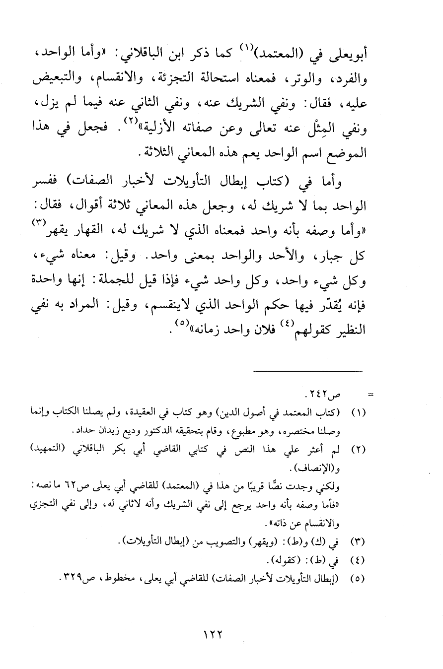 أبويعلى في المعتمد كما ذكر ابن الباقلاني وأما الواحد والفرد والوتر فمعناه استحالة التجزئة والانقسام والتبعيض عليه فقال ونفي الشريك عنه ونفي الثاني عنه فيما لم يزل ونفي المِثْل عنه تعالى وعن صفاته الأزلية فجعل في هذا الموضع اسم الواحد يعم هذه المعاني الثلاثة وأما في كتاب إبطال التأويلات لأخبار الصفات ففسر الواحد بما لا شريك له وجعل هذه المعاني ثلاثة أقوال فقال وأما وصفه بأنه واحد فمعناه الذي لا شريك له القهار يقهر كل جبار والحد والواحد بمعنى واحد وقيل معناه شيء وكل شيء واحد وكل واحد شيء فإذا قيل للجملة إنها واحدة فإنه يُقدّر فيها حكم الواحد الذي لاينقسم وقيل المراد به نفي النظير كقولهم فلان واحد زمانه