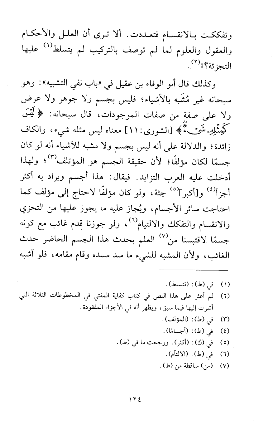 وتفككت بالانقسام فتعددت ألا ترى أن العلل والأحكام والعقول والعلوم لما لم توصف بالتركيب لم يتسلط عليها التجزئة وكذلك قال أبو الوفاء بن عقيل في باب نفي التشبيه وهو سبحانه غير مُشَبه بالأشياء فليس بجسم ولا جوهر ولا عرض ولا على صفة من صفات الموجودات قال سبحانه لَيْسَ كَمِثْلِهِ شَيْءٌ [الشورى 11] معناه ليس مثله شيء والكاف زائدة والدلالة على أنه ليس بجسم ولا مشبه للأشياء أنه لو كان جسمًا لكان مؤلفًا لأن حقيقة الجسم هو المؤتلف ولهذا أدخلت عليه العرب التزايد فيقال هذا أجسم ويراد به أكثر أجزأ وأكبر جثة ولو كان مؤلفًا لاحتاج إلى مؤلف كما احتاجت سائر الأجسام ويُجاز عليه ما يجوز عليها من التجزي والانقسام والتفكك والالتيام ولو جوزنا قِدم غائب مع كونه جسمًا لاقتبسنا من العلم بحدث هذا الجسم الحاضر حدث الغائب ولأن المشبه للشيء ما سد مسده وقام مقامه فلو أشبه