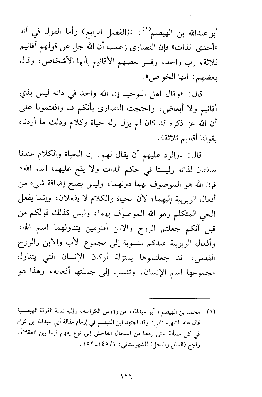 أبو عبد الله بن الهيصم الفصل الرابع وأما القول في أنه أحدي الذات فإن النصارى زعمت أن الله جل عن قولهم أقانيم ثلاثة رب واحد وفسر بعضهم الأقانيم بأنها الأشخاص وقال بعضهم إنها الخواص قال وقال أهل التوحيد إن الله واحد في ذاته ليس بذي أقانيم ولا أبعاض واحتجت النصارى بأنكم قد وافقتمونا على أن الله عز ذكره قد كان لم يزل وله حياة وكلام وذلك ما أردناه بقولنا أقانيم ثلاثة قال والرد عليهم أن يقال لهم إن الحياة والكلام عندنا صفتان لذاته وليستا في حكم الذات ولا يقع عليهما اسم الله فإن الله هو الموصوف بهما دونهما وليس يصح إضافة شيء من أفعال الربوبية إليهما لأن الحياة والكلام لا يفعلان وإنما يفعل الحي المتكلم وهو الله الموصوف بهما وليس كذلك قولكم من قبل أنكم جعلتم الروح والابن أقنومين يتناولهما اسم الله وأفعال الربوبية عندكم منسوبة إلى مجموع الأب والابن والروح القدس قد جعلتموها بمنزلة أركان الإنسان التي يتناول مجموعها اسم الإنسان وتنسب إلى جملتها أفعاله وهذا هو