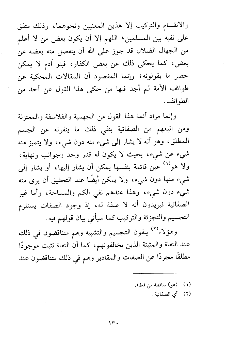 والانقسام والتركيب إلا هذين المعنيين ونحوهما وذلك متفق على نفيه بين المسلمين اللهم إلا أن يكون بعض من لا أعلم من الجهال الضلال قد جوز على الله أن ينفصل منه بعضه عن بعض كما يحكى ذلك عن بعض الكفار فبنو آدم لا يمكن حصر ما يقولونه وإنما المقصود أن المقالات المحكية عن طوائف الأمة لم أجد فيها من حكى هذا القول عن أحد من الطوائف وإنما مراد أئمة هذا القول من الجهمية والفلاسفة والمعتزلة ومن اتبعهم من الصفاتية بنفي ذلك ما ينفونه عن الجسم المطلق وهو أنه لا يشار إلى شيء منه دون شيء ولا يتميز منه شيء عن شيء بحيث لا يكون له قدر وحد وجوانب ونهاية ولا هو عين قائمة بنفسها يمكن أن يشار إليها أو يشار إلى شيء منها دون شيء ولا يمكن أيضًا عند التحقيق أن يرى منه شيء دون شيء وهذا عندهم نفي الكم والمساحة وأما غير الصفاتية فيريدون أنه لا صفة له إذ وجود الصفات يستلزم التجسيم والتجزئة والتركيب كما سيأتي بيان قولهم فيه وهؤلاء ينفون التجسيم والتشبيه وهم متناقضون في ذلك عند النفاة والمثبتة الذين يخالفونهم كما أن النفاة تثبت موجودًا مطلقًا مجردًا عن الصفات والمقادير وهم في ذلك متناقضون عند