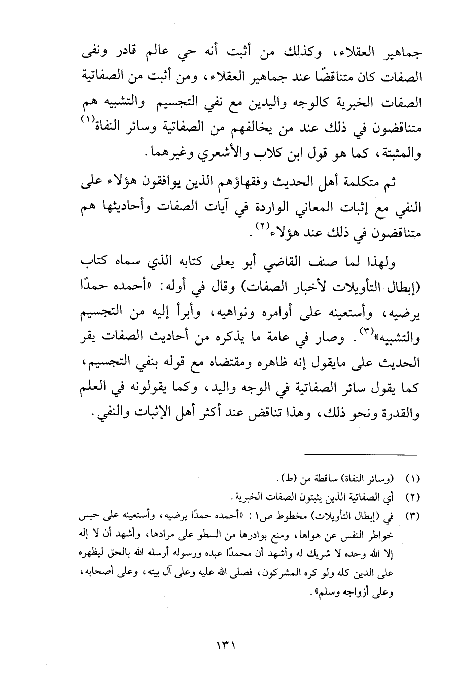 جماهير العقلاء وكذلك من أثبت أنه حي عالم قادر ونفى الصفات كان متناقضًا عند جماهير العقلاء ومن أثبت من الصفاتية الصفات الخبرية كالوجه واليدين مع نفي التجسيم والتشبيه هم متناقضون في ذلك عند من يخالفهم من الصفاتية وسائر النفاة والمثبتة كما هو قول ابن كلاب والأشعري وغيرهما ثم متكلمة أهل الحديث وفقهاؤهم الذين يوافقون هؤلاء على النفي مع إثبات المعاني الواردة في آيات الصفات وأحاديثها وهم متناقضون في ذلك عند هؤلاء ولهذا لما صنف القاضي أبو يعلى كتابه الذي سماه كتاب إبطال التأويلات لأخبار الصفات وقال في أوله أحمده حمدًا يرضيه وأستعينه على أوامره ونواهيه وأبرأ إليه من التجسيم والتشبيه وصار في عامة ما يذكره من أحاديث الصفات يقر الحديث على مايقول إنه ظاهره ومقتضاه مع قوله بنفي التجسيم كما يقول سائر الصفاتية في الوجه واليد وكما يقولونه في العلم والقدرة ونحو ذلك وهذا تناقض عند أكثر أهل الإثبات والنفي