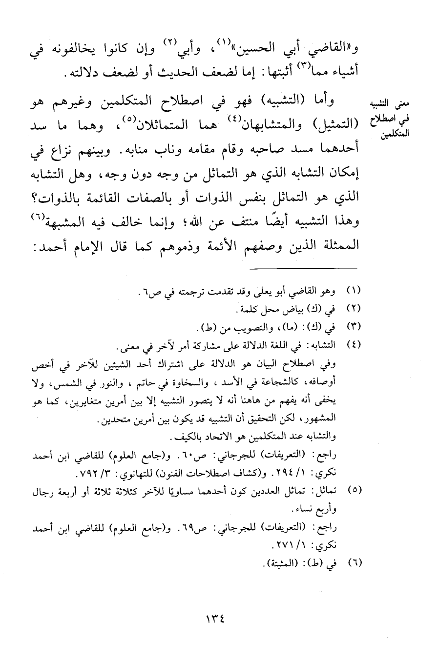 والقاضي أبي الحسين وأبي وإن كانوا يخالفونه في أشياء مما أثبتها إما لضعف الحديث أو لضعف دلالته وأما التشبيه فهو اصطلاح المتكلمين وغيرهم هو التمثيل والمتشابهان هما المتماثلان وهما ما سد أحدهما مسد صاحبه وقام مقامه وناب منابه وبينهم نزاع في إمكان التشابه الذي هو التماثل من وجه دون وجه وهل التشابه الذي هو التماثل بنفس الذوات أو بالصفات القائمة بالذوات وهذا التشبيه أيضًا منتف عن الله وإنما خالف فيه المشبهة الممثلة الذين وصفهم الأئمة وذموهم كما قال الإمام أحمد