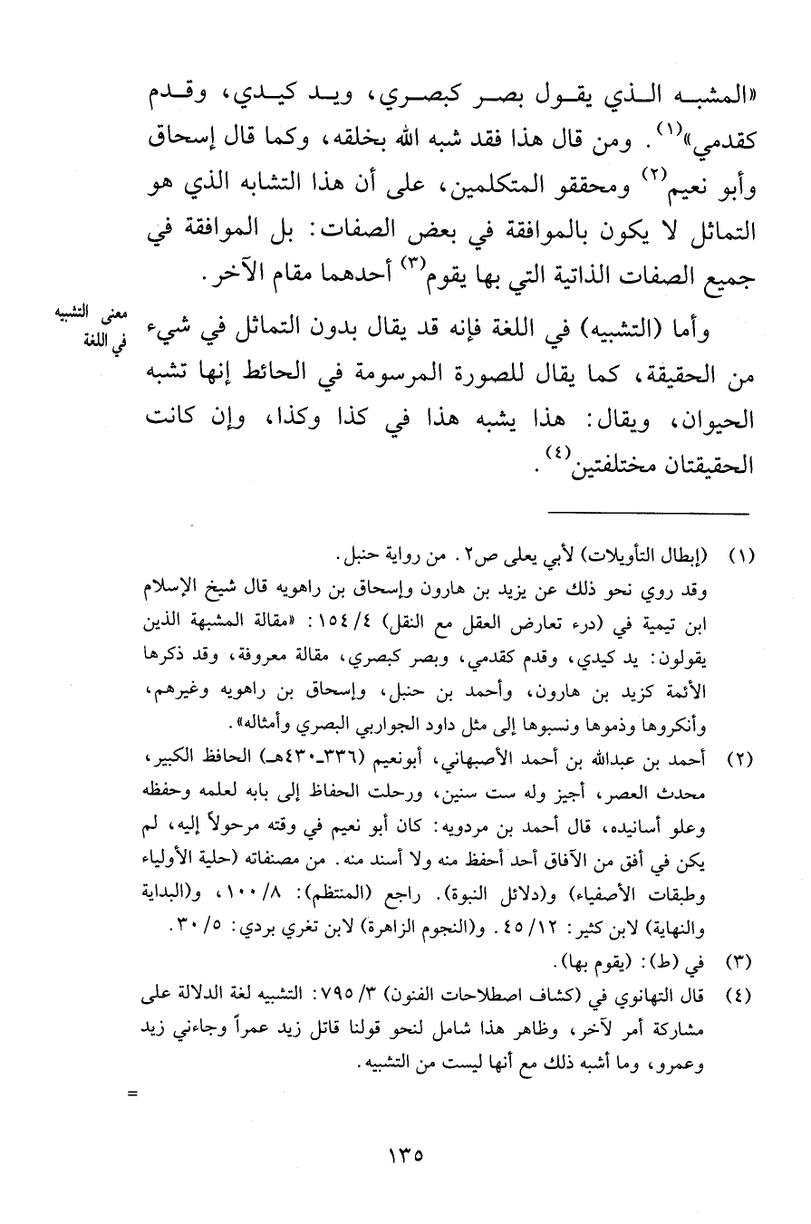 المشبه الذي يقول بصر كبصري ويد كيدي وقدم كقدمي ومن قال ذلك فقد شبه الله بخلقه وكما قال إسحاق وأبو نعيم ومحققو المتكلمين على أن هذا التشابه الذي هو التماثل لا يكون بالموافقة في بعض الصفات بل الموافقة في جميع الصفات الذاتية التي بها يقوم أحدهما مقام الآخر وأما التشبيه في اللغة فإنه قد يقال بدون التماثل في شيء من الحقيقة كما يقال للصورة المرسومة في الحائط إنها تشبه الحيوان ويقال هذا يشبه هذا في كذا وكذا وإن كانت الحقيقتان مختلفتين