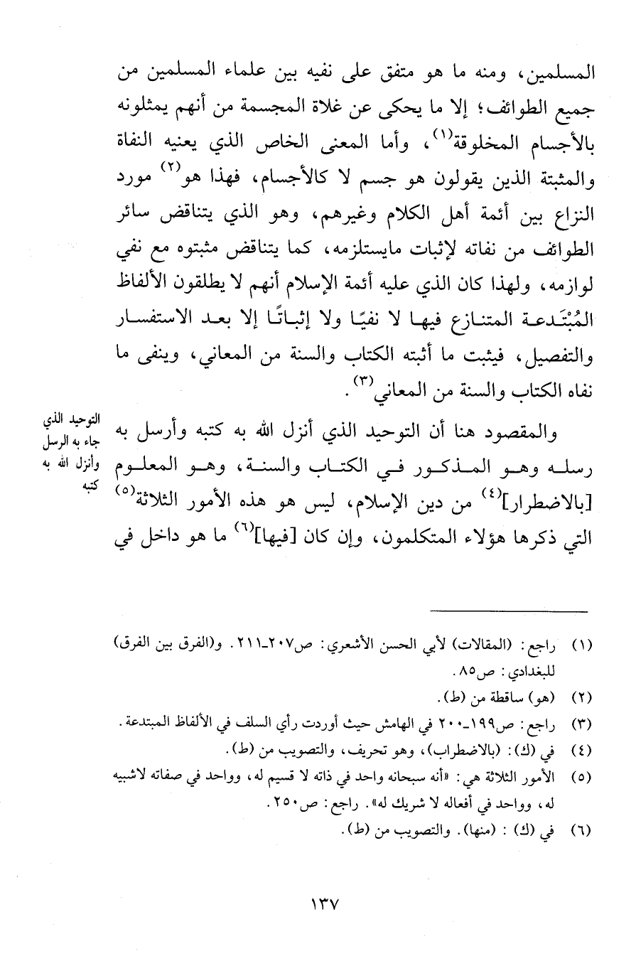 المسلمين ومنه ما هو متفق على نفيه بين علماء المسلمين من جميع الطوائف إلا ما يحكى عن غلاة المجسمة من أنهم يمثلونه بالأجسام المخلوقة وأما المعنى الخاص الذي يعنيه النفاة والمثبتة الذين يقولون هو جسم لا كالأجسام فهذا هو مورد النزاع بين أئمة أهل الكلام وغيرهم وهو الذي يتناقض سائر الطوائف من نفاته لإثبات مايستلزمه كما يتناقض مثبتوه مع نفي لوازمه ولهذا كان الذي عليه أئمة الإسلام أنهم لا يطلقون الألفاظ المُبْتَدعة المتنازع فيها لا نفيًا ولا إثباتًا إلا بعد الاستفسار والتفصيل فيثبت ما أثبته الكتاب والسنة من المعاني وينفي ما نفاه الكتاب والسنة من المعاني والمقصود هنا أن التوحيد الذي أنزل الله به كتبه وأرسل به رسله وهو المذكور في الكتاب والسنة وهو المعلوم بالاضطرار من دين الإسلام ليس هو هذه الأمور الثلاثة التي ذكرها هؤلاء المتكلمون وإن كان فيها ما هو داخل في