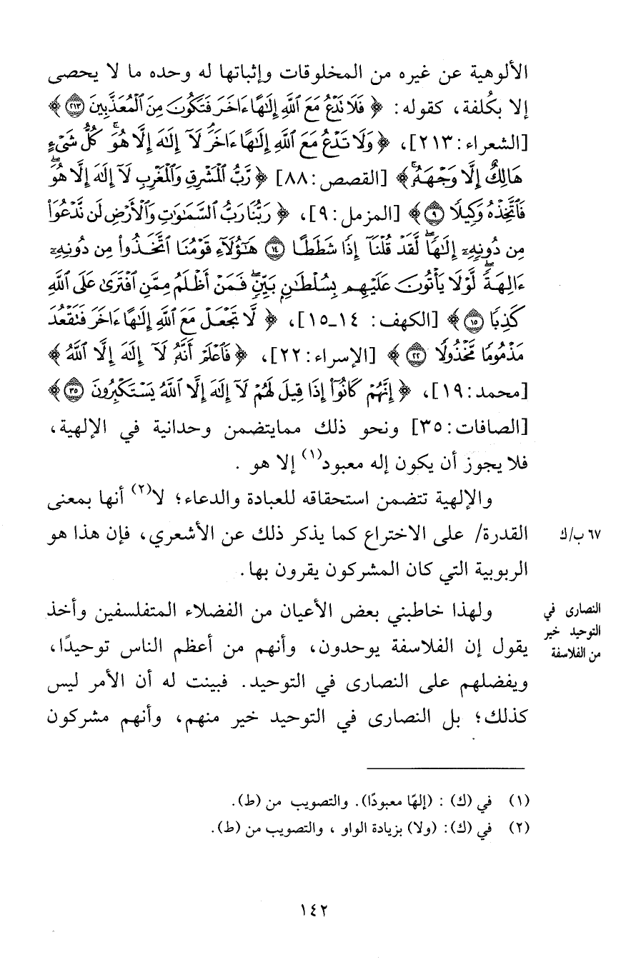 الألوهية عن غيره من المخلوقات وإثباتها له وحده ما لا يحصى إلا بكُلفة كقوله فَلَا تَدْعُ مَعَ اللَّهِ إِلَهاً آخَرَ فَتَكُونَ مِنَ الْمُعَذَّبِينَ {213} [الشعراء 213] وَلَا تَدْعُ مَعَ اللَّهِ إِلَهاً آخَرَ لَا إِلَهَ إِلَّا هُوَ كُلُّ شَيْءٍ هَالِكٌ إِلَّا وَجْهَهُ [القصص 88] رَبُّ الْمَشْرِقِ وَالْمَغْرِبِ لَا إِلَهَ إِلَّا هُوَ فَاتَّخِذْهُ وَكِيلاً {9} [المزمل 9] رَبُّنَا رَبُّ السَّمَاوَاتِ وَالْأَرْضِ لَن نَّدْعُوَ مِن دُونِهِ إِلَهاً لَقَدْ قُلْنَا إِذاً شَطَطاً {14} هَؤُلَاء قَوْمُنَا اتَّخَذُوا مِن دُونِهِ آلِهَةً لَّوْلَا يَأْتُونَ عَلَيْهِم بِسُلْطَانٍ بَيِّنٍ فَمَنْ أَظْلَمُ مِمَّنِ افْتَرَى عَلَى اللَّهِ كَذِباً {15} [الكهف 14-15] لاَّ تَجْعَل مَعَ اللهِ إِلَهاً آخَرَ فَتَقْعُدَ مَذْمُوماً مَّخْذُولاً {22} [الإسراء 22] فَاعْلَمْ أَنَّهُ لَا إِلَهَ إِلَّا اللَّهُ [محمد 19] إِنَّهُمْ كَانُوا إِذَا قِيلَ لَهُمْ لَا إِلَهَ إِلَّا اللَّهُ يَسْتَكْبِرُونَ {35} [الصافات 35] ونحو ذلك ممايتضمن وحدانية في الإلهية فلا يجوز أن يكون إله معبود إلا هو والإلهية تتضمن استحقاقه للعبادة والدعاء لا أنها بمعنى القدرة على الاختراع كما يذكر ذلك عن الأشعري فإن هذا هو الربوبية التي كان المشركون يقرون بها ولهذا خاطبني بعض الأعيان من الفضلاء المتفلسفين وأخذ يقول إن الفلاسفة يوحدون وأنهم من أعظم الناس توحيدًا ويفضلهم على النصارى في التوحيد فبينت له أن الأمر ليس كذلك بل النصارى في التوحيد خير منهم وأنهم مشركون