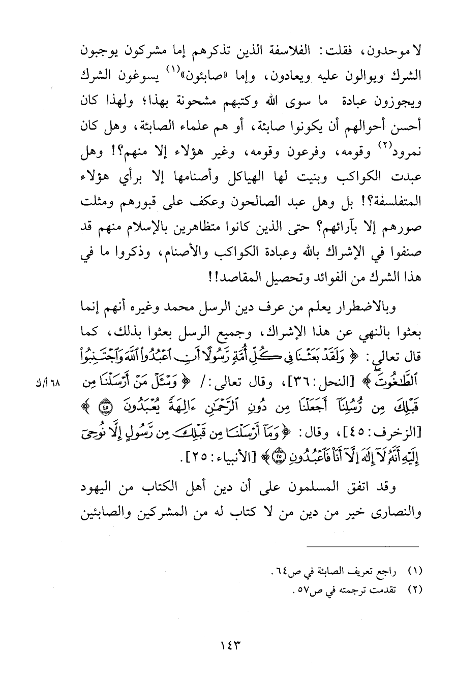لا موحدون فقلت الفلاسفة الذين تذكرهم إما مشركون يوجبون الشرك ويوالون عليه ويعادون وإما صابئون يسوغون الشرك ويجوزون عبادة ما سوى الله وكتبهم مشحونة بهذا ولهذا كان أحسن أحوالهم أن يكون صابئة أو هم علماء الصابئة وهل كان نمرود وقومه وفرعون وقومه وغير هؤلاء إلا منهم وهل عبدت الكواكب وبنيت لها الهياكل وأصنامها إلا برأي هؤلاء المتفلسفة بل وهل عبد الصالحون وعكف على قبورهم ومثلت صورهم إلا بآرائهم حتى الذين كانوا متظاهرين بالإسلام منهم قد صنفوا في الإشراك بالله وعبادة الكواكب والأصنام وذكروا ما في هذا الشرك من الفوائد وتحصيل المقاصد وبالاضطرار يعلم من عرف دين الرسل محمد وغيره أنهم إنما بعثوا بالنهي عن هذا الإشراك وجميع الرسل بعثوا بذلك كما قال تعالى وَلَقَدْ بَعَثْنَا فِي كُلِّ أُمَّةٍ رَّسُولاً أَنِ اعْبُدُواْ اللهَ وَاجْتَنِبُواْ الطَّاغُوتَ [النحل 36] وقال تعالى وَاسْأَلْ مَنْ أَرْسَلْنَا مِن قَبْلِكَ مِن رُّسُلِنَا أَجَعَلْنَا مِن دُونِ الرَّحْمَنِ آلِهَةً يُعْبَدُونَ {45} [الزخرف 45] وقال وَمَا أَرْسَلْنَا مِن قَبْلِكَ مِن رَّسُولٍ إِلَّا نُوحِي إِلَيْهِ أَنَّهُ لَا إِلَهَ إِلَّا أَنَا فَاعْبُدُونِ {25} [الأنبياء 25] وقد اتفق المسلمون على أن دين أهل الكتاب من اليهود والنصارى خير من دين من لا كتاب له من المشركين والصابئين