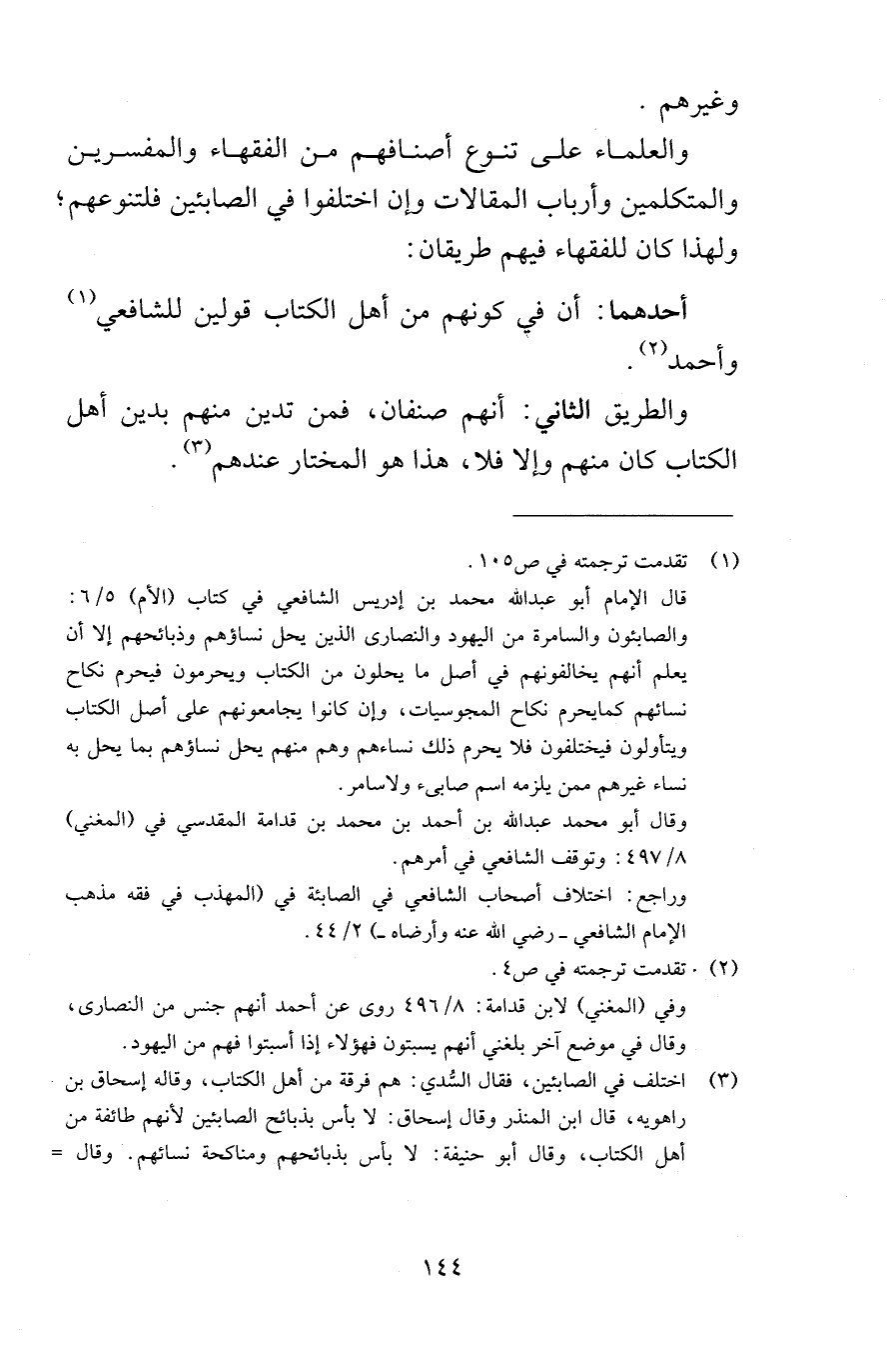 وغيرهم والعلماء على تنوع أصنافهم من الفقهاء والمفسرين والمتكلمين وأرباب المقالات وإن اختلفوا في الصابئين فلتنوعهم ولهذا كان للفقهاء فيهم طريقان أحدهما أن في كونهم من أهل الكتاب قولين للشافعي وأحمد والطريق الثاني أنهم صنفان فمن تدين منهم بدين أهل الكتاب كان منهم وإلا فلا هذا هو المختار عندهم