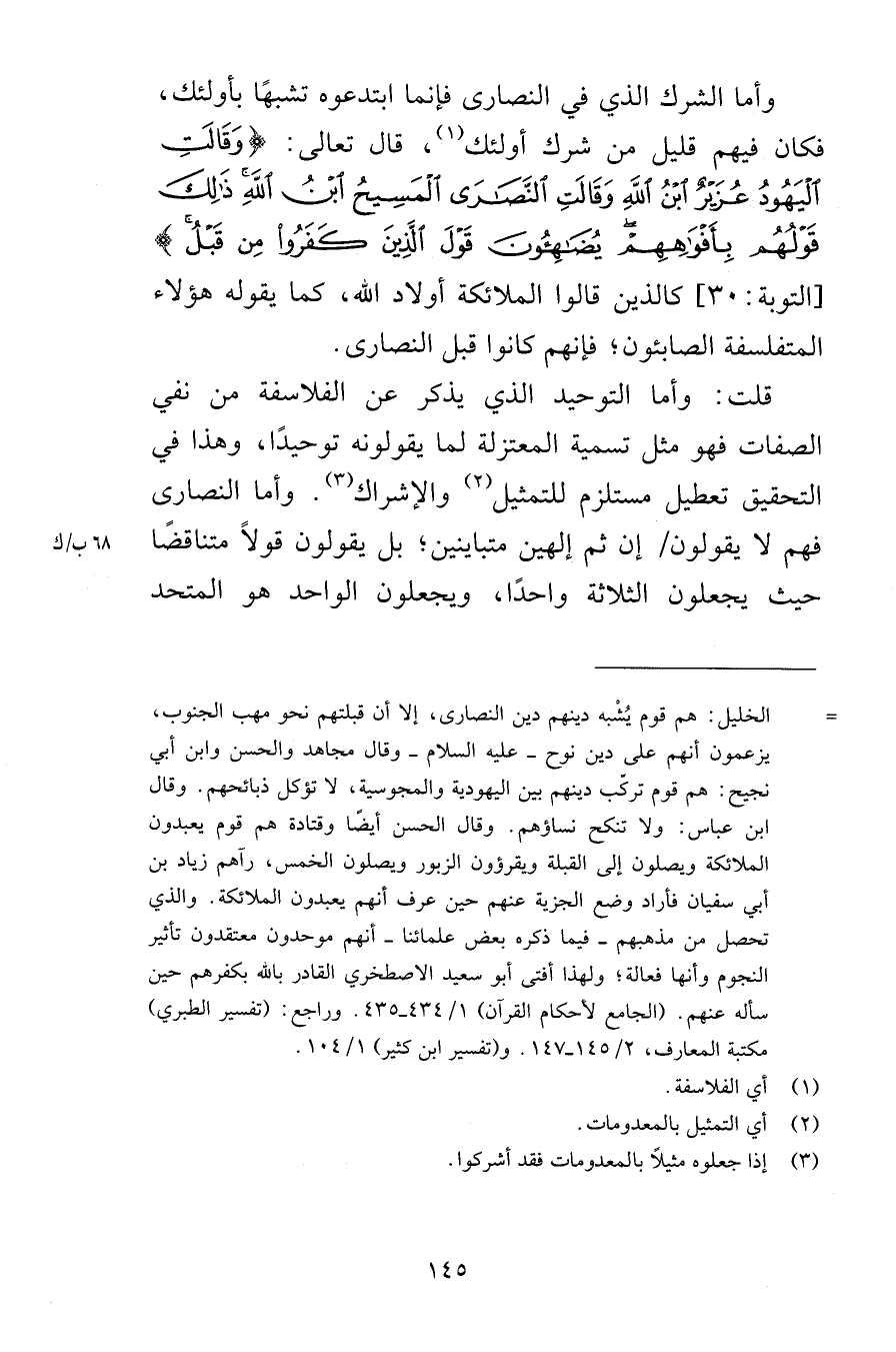وأما الشرك الذي في النصارى فإنما ابتدعوه تشبهًا بأولئك فكان فيهم قليل من شرك أولئك قال تعالى وَقَالَتِ الْيَهُودُ عُزَيْرٌ ابْنُ اللهِ وَقَالَتْ النَّصَارَى الْمَسِيحُ ابْنُ اللهِ ذَلِكَ قَوْلُهُم بِأَفْوَاهِهِمْ يُضَاهِؤُونَ قَوْلَ الَّذِينَ كَفَرُواْ مِن قَبْلُ [التوبة 30] كالذين قالوا الملائكة أولاد الله كما يقوله هؤلاء المتفلسفة الصابئون فإنهم كانوا قبل النصارى قلت وأما التوحيد الذي يذكر عن الفلاسفة من نفي الصفات فهو مثل تسمية المعتزلة لما يقولونه توحيدًا وهذا في التحقيق تعطيل مستلزم للتمثيل والإشراك وأما النصارى فهم لا يقولون عن ثم إلهين متباينين بل يقولون قولاً متناقضًا حيث يجعلون الثلاثة واحدًا ويجعلون الواحد هو المتحد