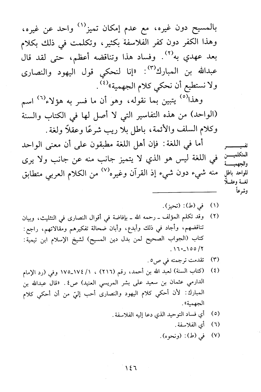 بالمسيح دون غيره مع عدم إمكان تميز واحد عن غيره وهذا الكفر دون كفر الفلاسفة بكثير وتكلمت في ذلك بكلام بعد عهدي به وفساد هذا وتناقضه أعظم حتى لقد قال عبد الله بن المبارك إنا لنحكي قول اليهود والنصارى ولا نستطيع أن نحكي كلام الجهمية وهذا يتبين بما نقوله وهو أن ما فسر به هؤلاء اسم الواحد من هذه التفاسير التي لا اصل لها في الكتاب والسنة وكلام السلف والأئمة باطل بلا ريب شرعًا وعقلاً ولغة أما في اللغة فإن أهل اللغة مطبقون على أن معنى الواحد في اللغة ليس هو الذي لا يتميز جانب منه عن جانب ولا يرى منه شيء دون شيء إذ القرآن وغيره من الكلام العربي متطابق