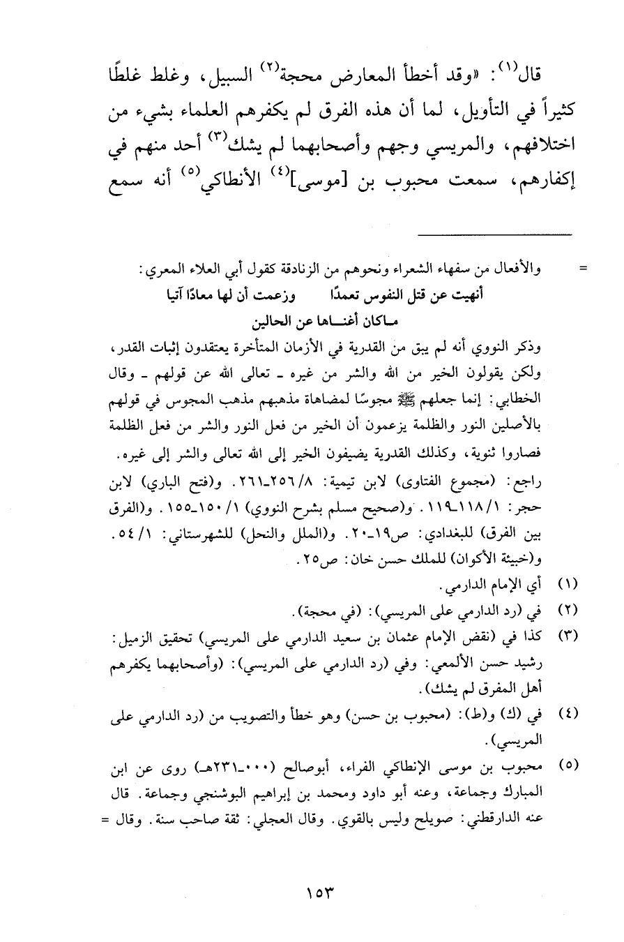 قال وقد أخطأ المعارض محجة السبيل وغلط غلطًا كثيرًا في التأويل لما أن هذه الفرق لم يكفرهم العلماء بشيء من اختلافهم والمريسي وجهم وأصحابهما لم يشك أحد منهم في إكفارهم سمعت محبوب بن موسى الأنطاكي أنه سمع