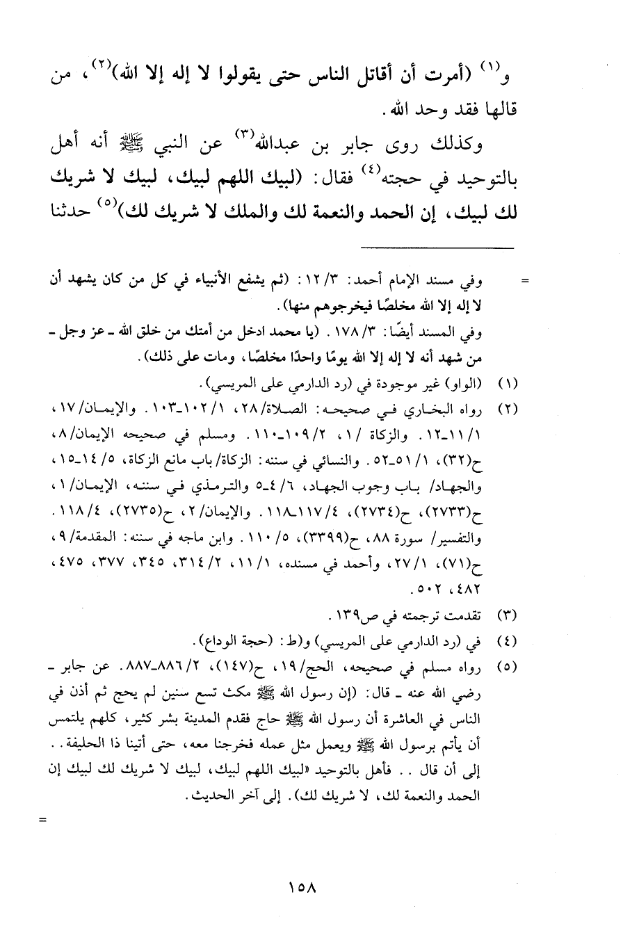 وأمرت أن أقاتل الناس حتى يقولوا لا إله إلا الله من قالها فقد وحد الله وكذلك روى جابر بن عبد الله عن النبي صلى الله عليه وسلم أنه أهل بالتوحيد في حجته فقال لبيك اللهم لبيك لبيك لا شريك لك لبيك إن الحمد والنعمة لك والملك لا شريك لك حدثنا