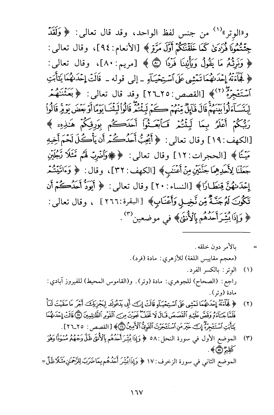 والوِتر من جنس لفظ الواحد وقد قال تعالى وَلَقَدْ جِئْتُمُونَا فُرَادَى كَمَا خَلَقْنَاكُمْ أَوَّلَ مَرَّةٍ [الأنعام 94] وقال تعالى وَنَرِثُهُ مَا يَقُولُ وَيَأْتِينَا فَرْداً {80} [مريم 80] وقال تعالى فَجَاءتْهُ إِحْدَاهُمَا تَمْشِي عَلَى اسْتِحْيَاء إلى قوله قَالَتْ إِحْدَاهُمَا يَا أَبَتِ اسْتَأْجِرْهُ [القصص 25-26] وقد قال تعالى بَعَثْنَاهُمْ لِيَتَسَاءلُوا بَيْنَهُمْ قَالَ قَائِلٌ مِّنْهُمْ كَمْ لَبِثْتُمْ قَالُوا لَبِثْنَا يَوْماً أَوْ بَعْضَ يَوْمٍ قَالُوا رَبُّكُمْ أَعْلَمُ بِمَا لَبِثْتُمْ فَابْعَثُوا أَحَدَكُم بِوَرِقِكُمْ هَذِهِ [الكهف 19] وقال تعالى أَيُحِبُّ أَحَدُكُمْ أَن يَأْكُلَ لَحْمَ أَخِيهِ مَيْتاً [الحجرات 12] وقال تعالى وَاضْرِبْ لَهُم مَّثَلاً رَّجُلَيْنِ جَعَلْنَا لِأَحَدِهِمَا جَنَّتَيْنِ مِنْ أَعْنَابٍ [الكهف 32] وقال وَآتَيْتُمْ إِحْدَاهُنَّ قِنطَاراً [النساء 20] وقال تعالى أَيَوَدُّ أَحَدُكُمْ أَن تَكُونَ لَهُ جَنَّةٌ مِّن نَّخِيلٍ وَأَعْنَابٍ [البقرة 266] وقال تعالى وَإِذَا بُشِّرَ أَحَدُهُمْ بِالأُنثَى في موضعين