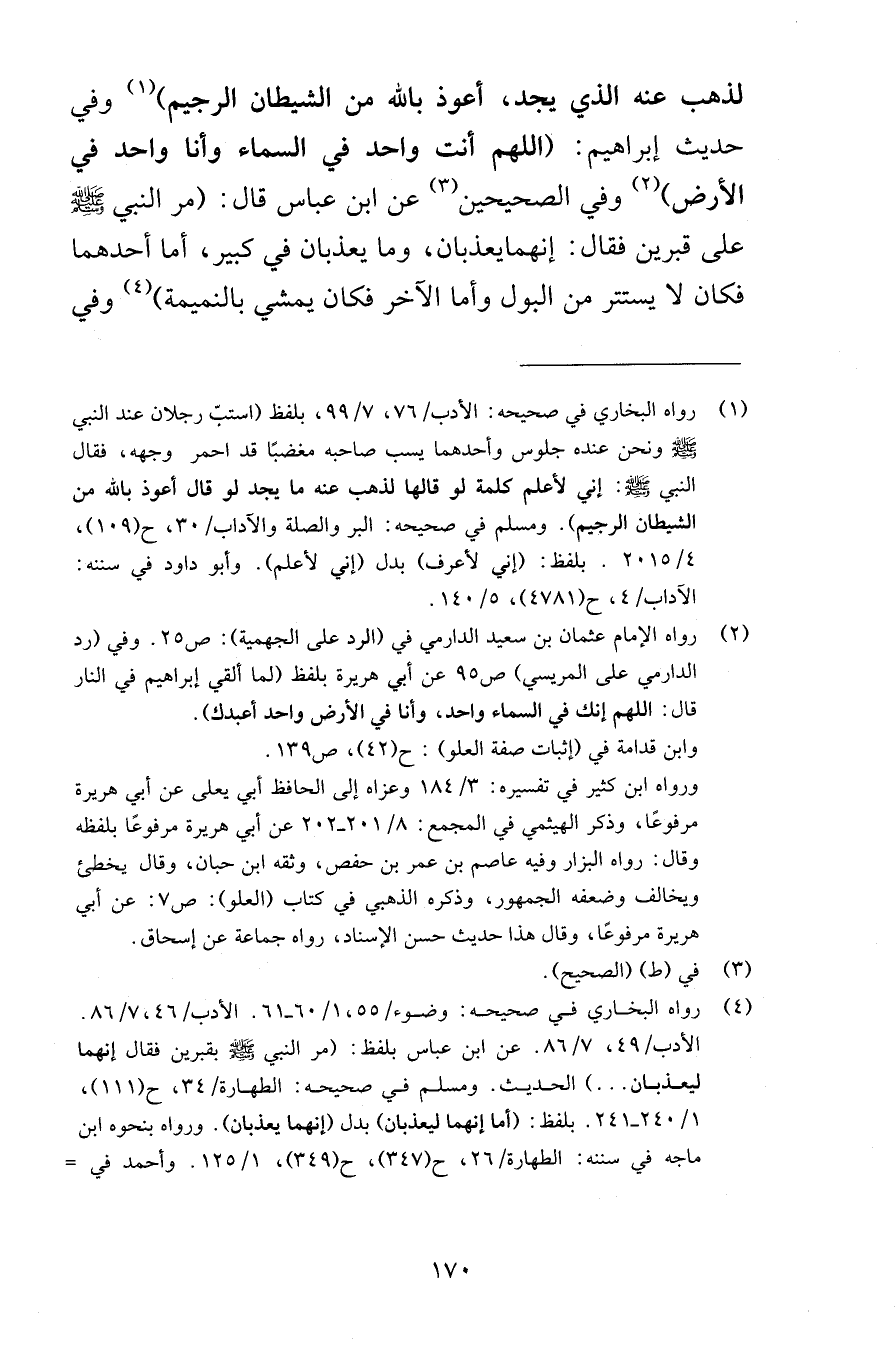 لذهب عنه الذي يجد أعوذ بالله من الشيطان الرجيم وفي حديث إبراهيم اللهم أنت واحد في السماء وأنا واحد في الأرض وفي الصحيحين عن ابن عباس قال مر النبي صلى الله عليه وسلم على قبرين فقال إنهمايعذبان وما يعذبان في كبير أما أحدهما فكان لا يستتر من البول وأما الآخر فكان يمشي بالنميمة وفي