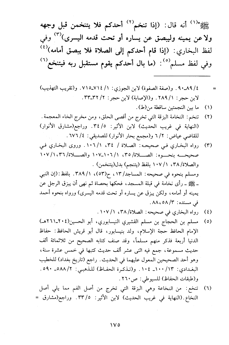 صلى الله عليه وسلم أنه قال إذا تنخم أحدكم فلا يتنخمن قبل وجهه ولا عن يمينه وليبصق عن يساره أو تحت قدمه اليسرى وفي لفظ البخاري إذا قام أحدكم إلى الصلاة فلا يبصق أمامه وفي لفظ مسلم ما بال أحدكم يقوم مستقبل ربه فيتنخع