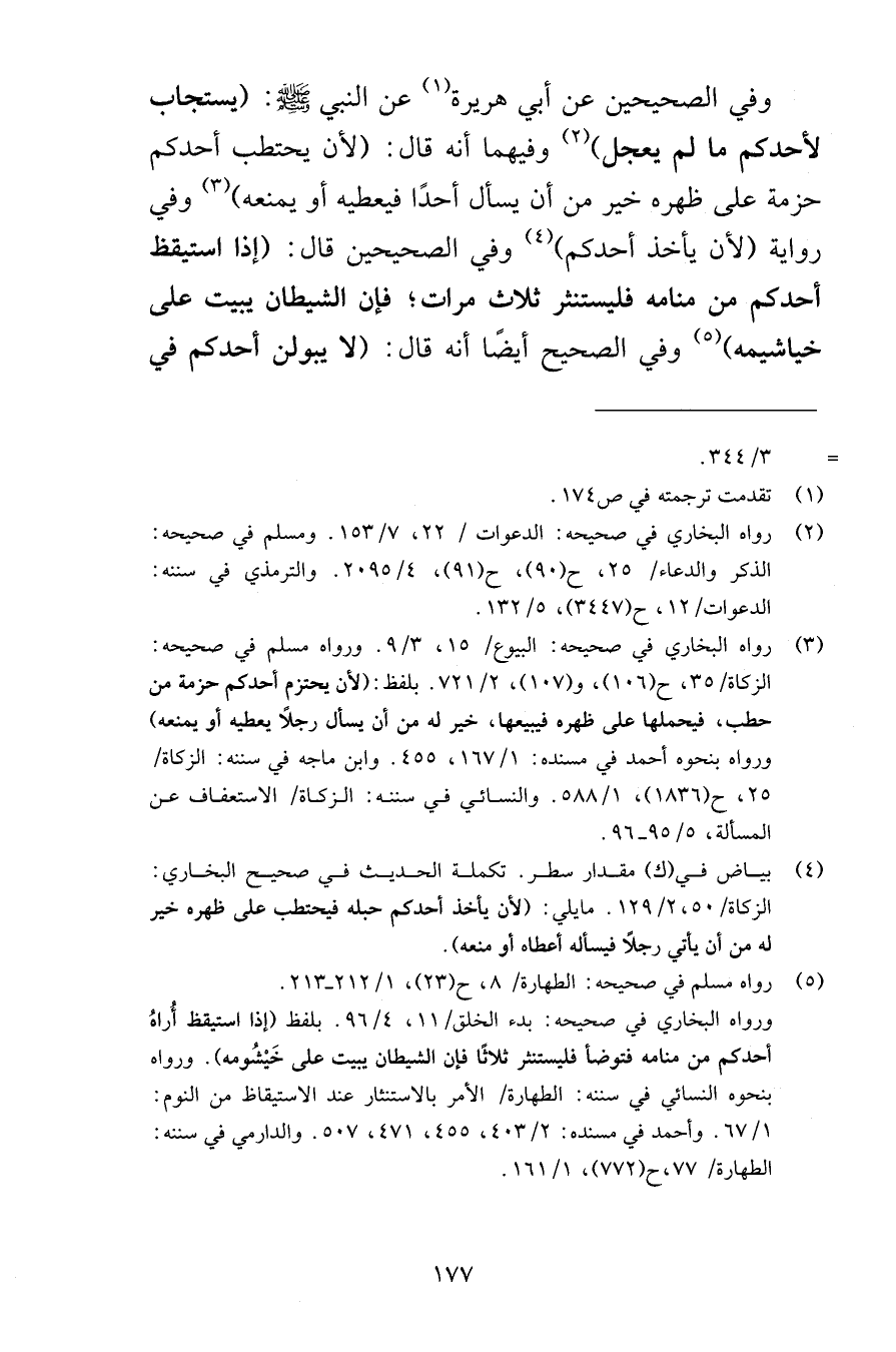 وفي الصحيحين عن أبي هريرة عن النبي صلى الله عليه وسلم يستجاب لأحدكم ما لم يعجل وفيهما أنه قال لأن يحتطب أحدكم حزمة على ظهره خير من أن يسأل أحدًا فيعطيه أو يمنعه وفي رواية لأن يأخذ أحدكم وفي الصحيحين قال إذا استيقظ أحدكم من منامه فليستنثر ثلاث مرات فإن الشيطان يبيت على خياشيمه وفي الصحيح أيضًا أنه قال لا يبولن أحدكم في